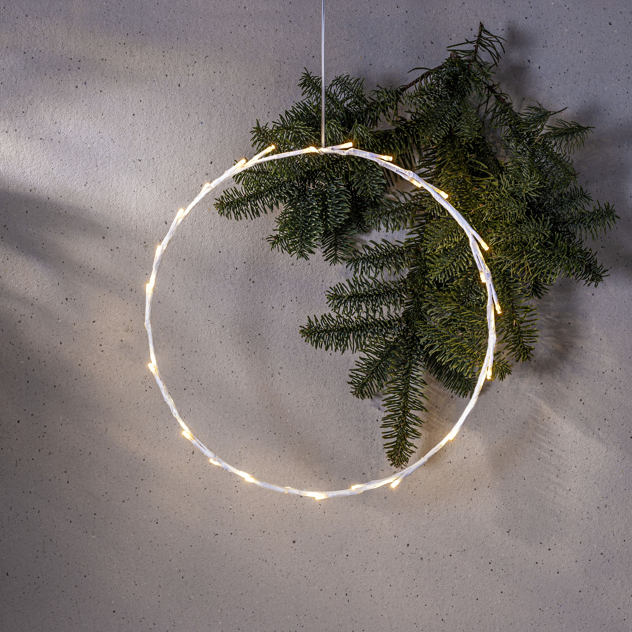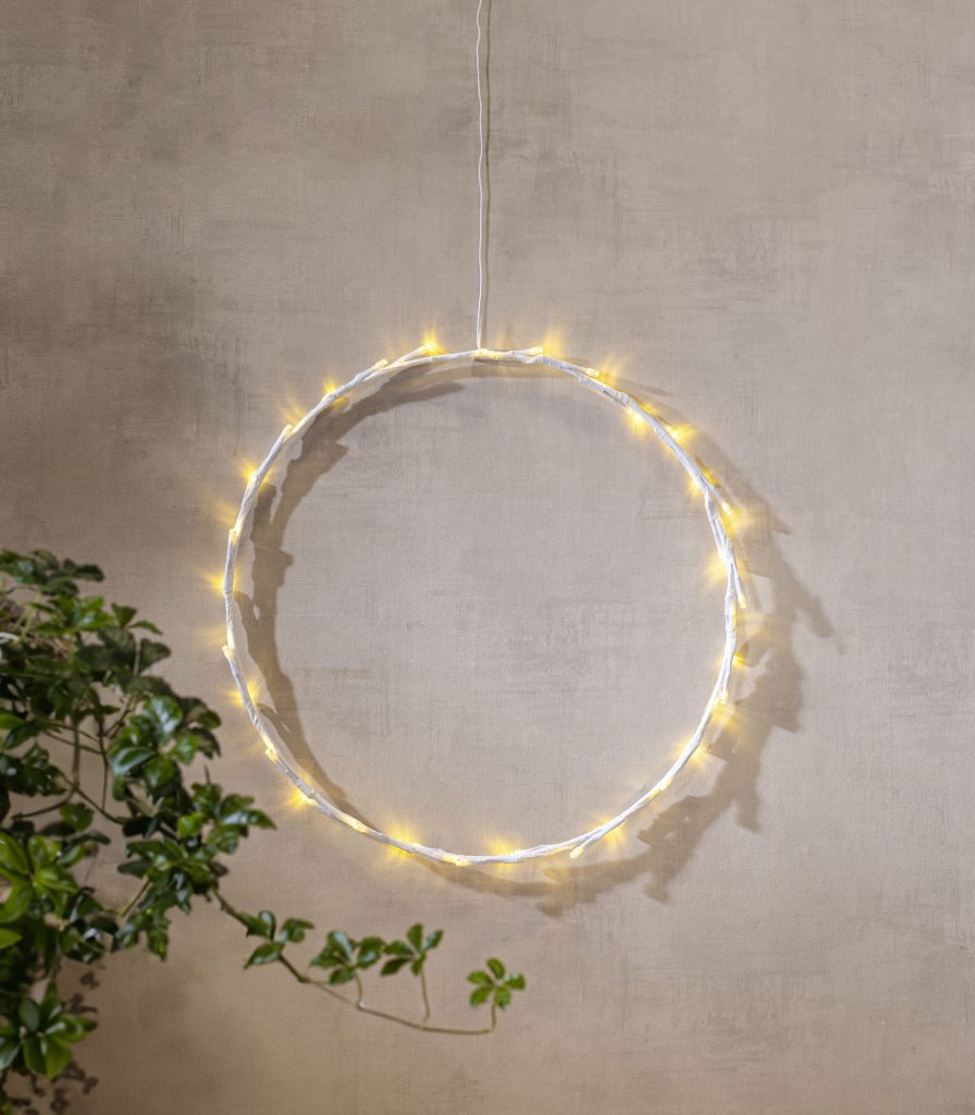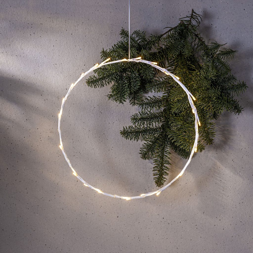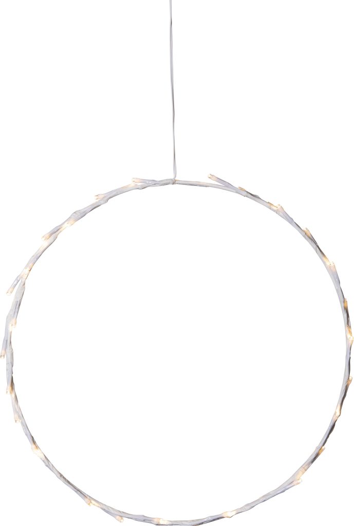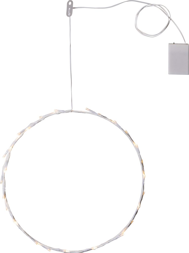 Paristokäyttöinen tyylikäs ja pelkistetty valkoinen pyöreä kranssi sisäkäyttöön. Koristeessa on 30 pientä LED-valopistettä, jotka loistavat lämpimän valkoista valoa. Käytä koristeena joulunaikaan tai vaikkapa heti pimeän vuodenajan alkaessa.