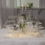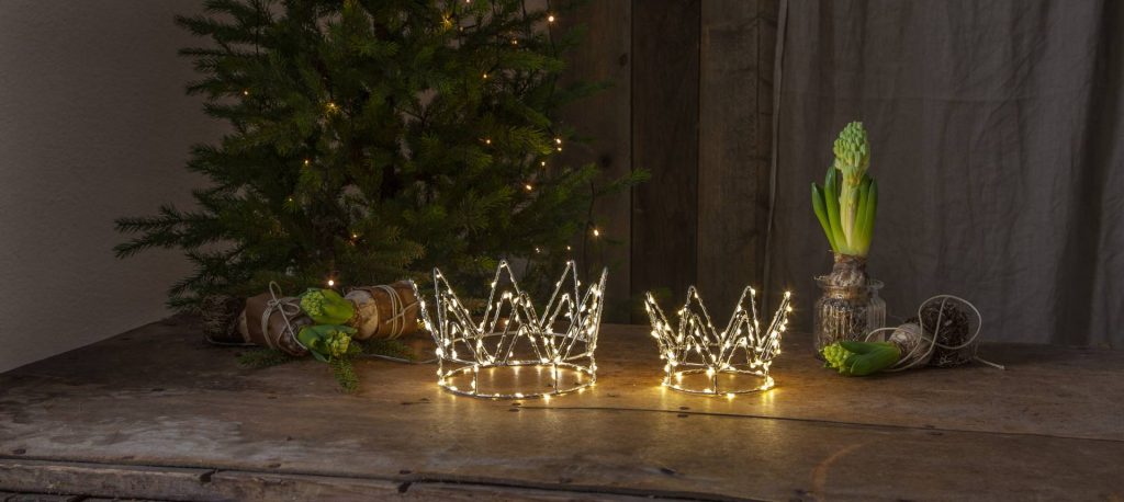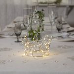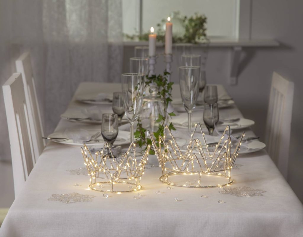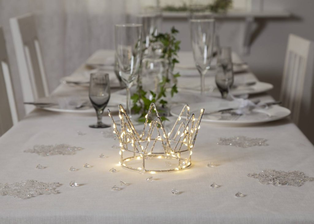 Kaunis kruunun muotoinen pöytäkoriste sisäkäyttöön. Sopii sekä joulukoristeeksi, että juhlakattaukseen. Kruunun ympärille on kiedottu Dew Drop -valosarja, jossa loistaa 70 lämpimän valkoista LED-valoa.