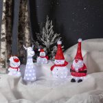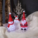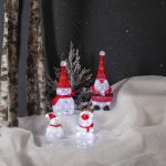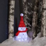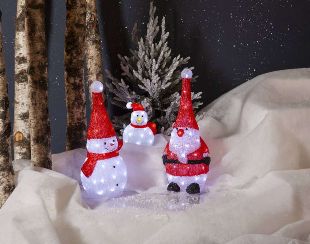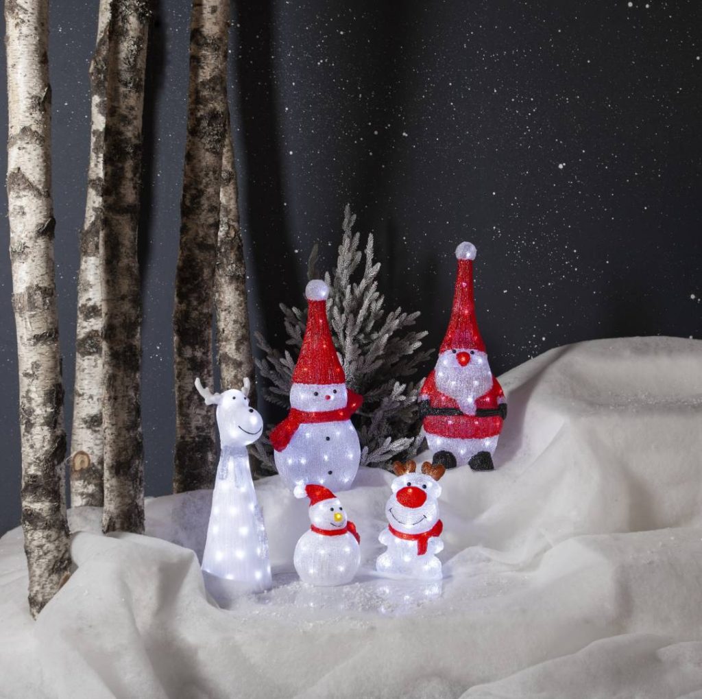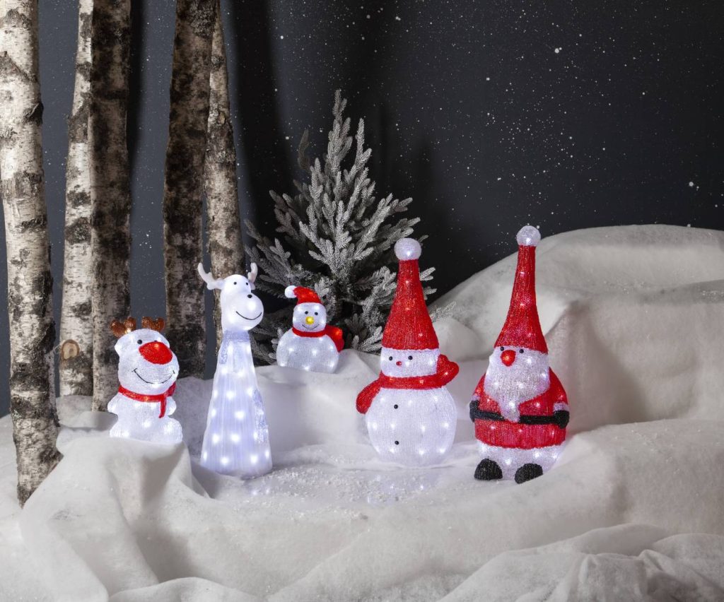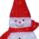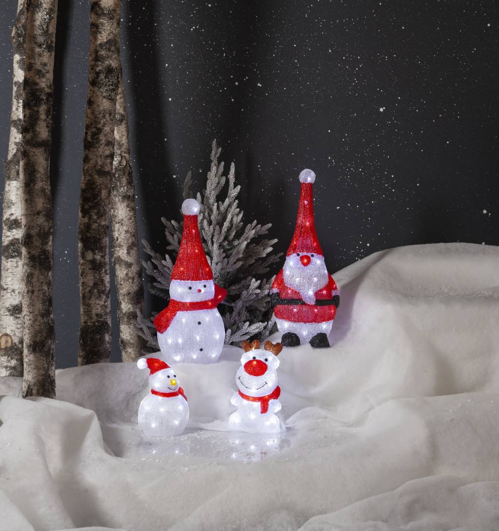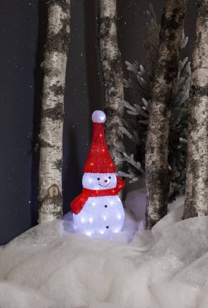 Lumiukko-koristehahmo, joka sopii sekä sisä- että ulkokäyttöön. Aseta koriste esimerkiksi puutarhaan, joulukuusen viereen tai ulko-oven läheisyyteen. Koristetta valaisee 40 pientä valkoista LED-valopistettä.