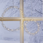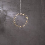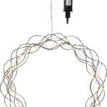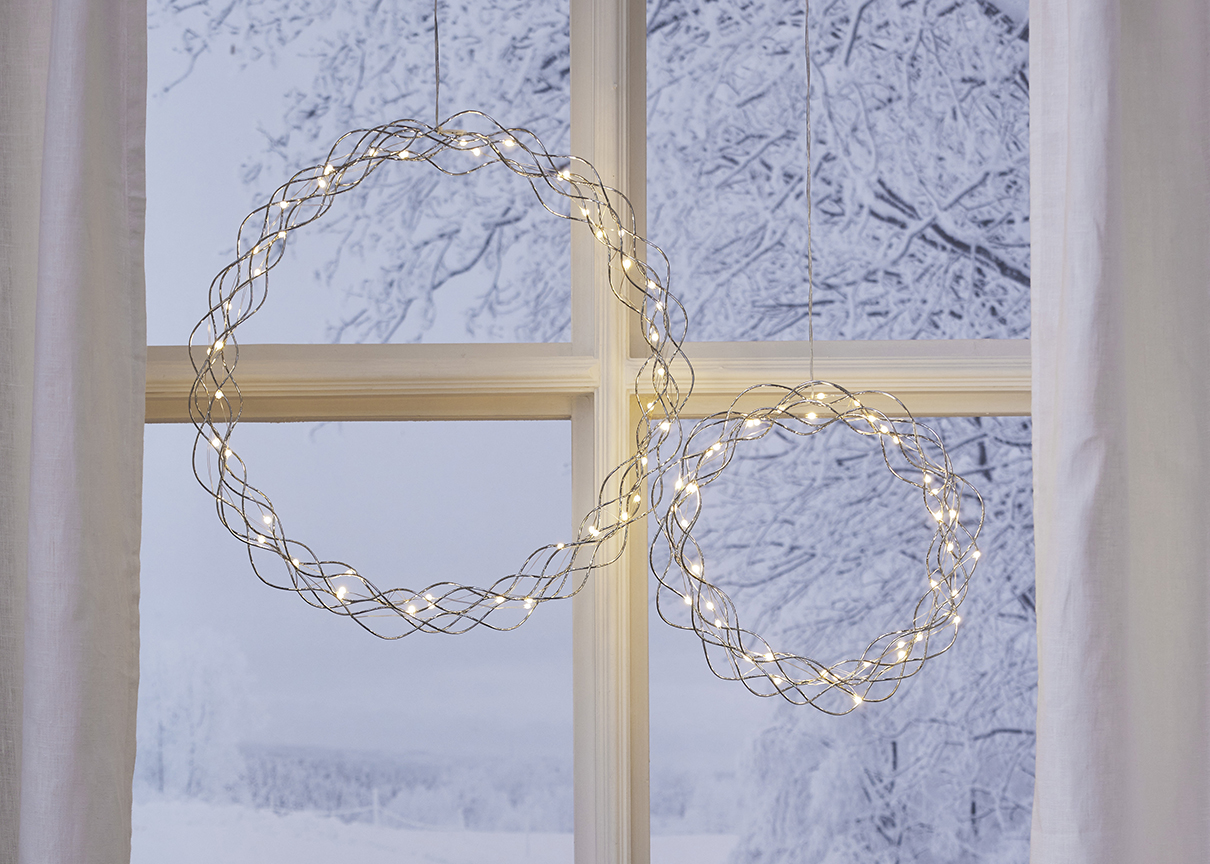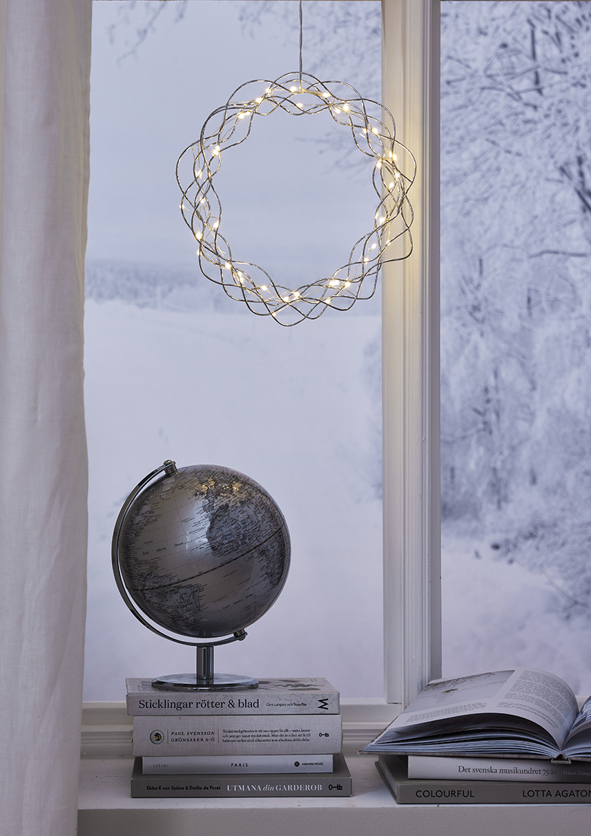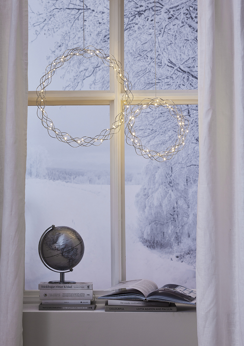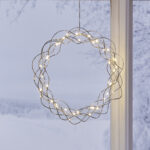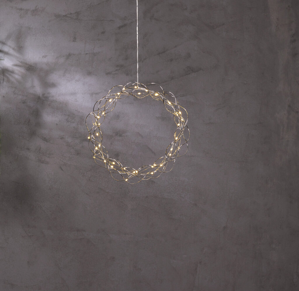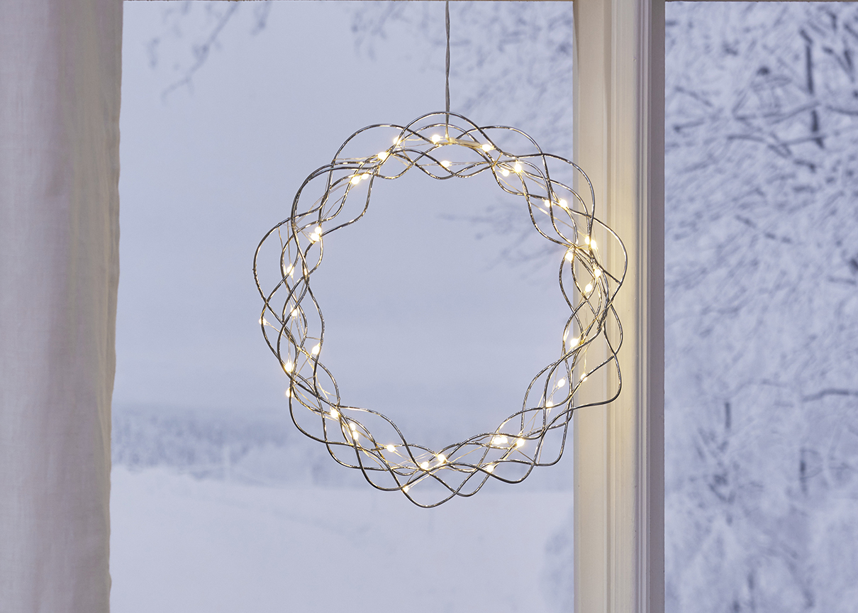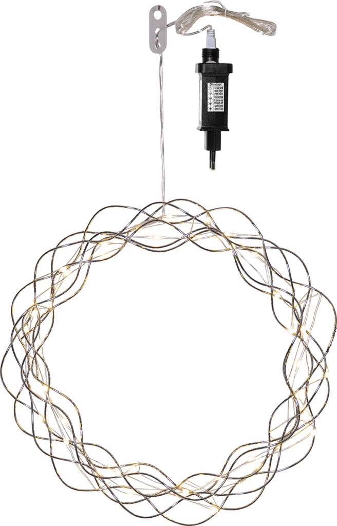 Koristeellinen hopean värinen metallikranssi dew drop-valoilla. Kranssissa on 40 LED-valopistettä, joissa on lämpimän valkoinen valo. Kaunis koriste, jonka voi ripustaa esimerkiksi ikkunaan.