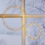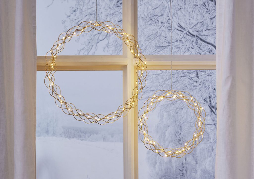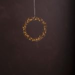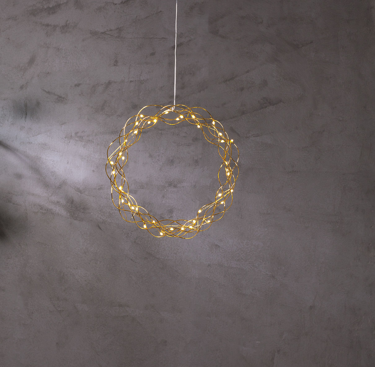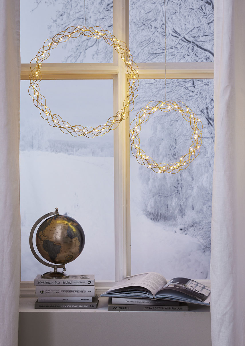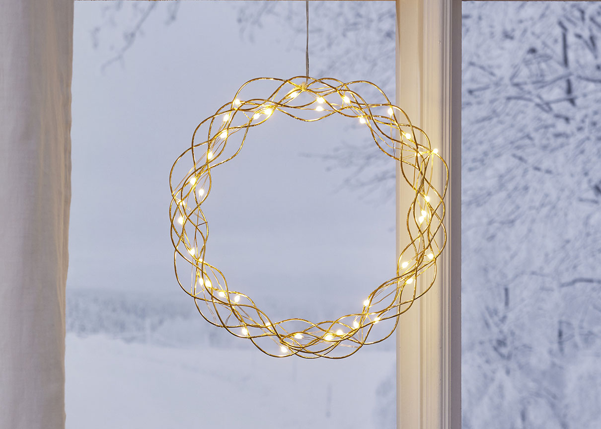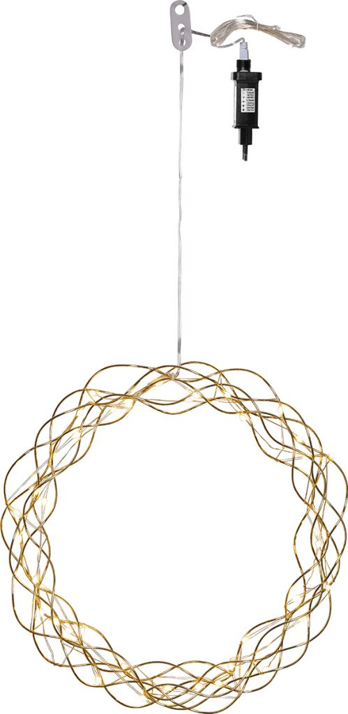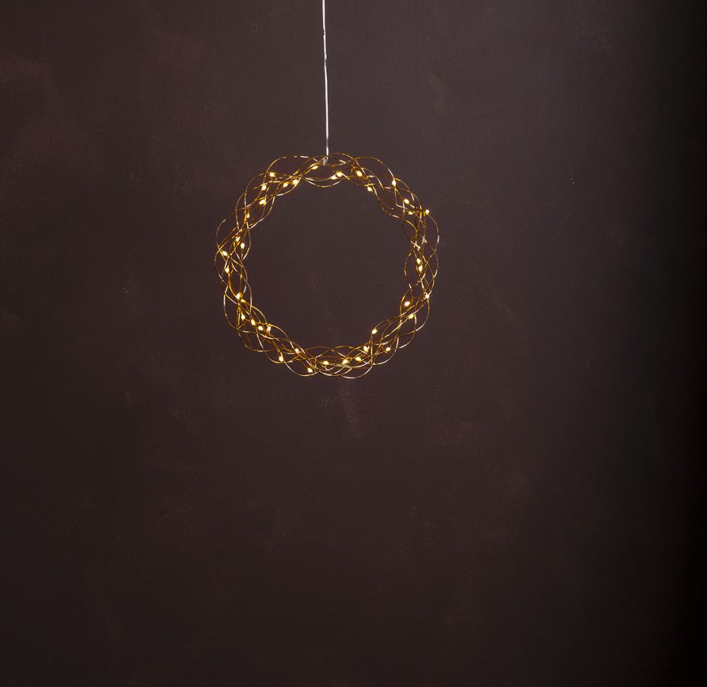 Koristeellinen messingin värinen metallikranssi dew drop-valoilla. Kranssissa on 40 LED-valopistettä, joissa on lämpimän valkoinen valo. Kaunis koriste, jonka voi ripustaa esimerkiksi ikkunaan.