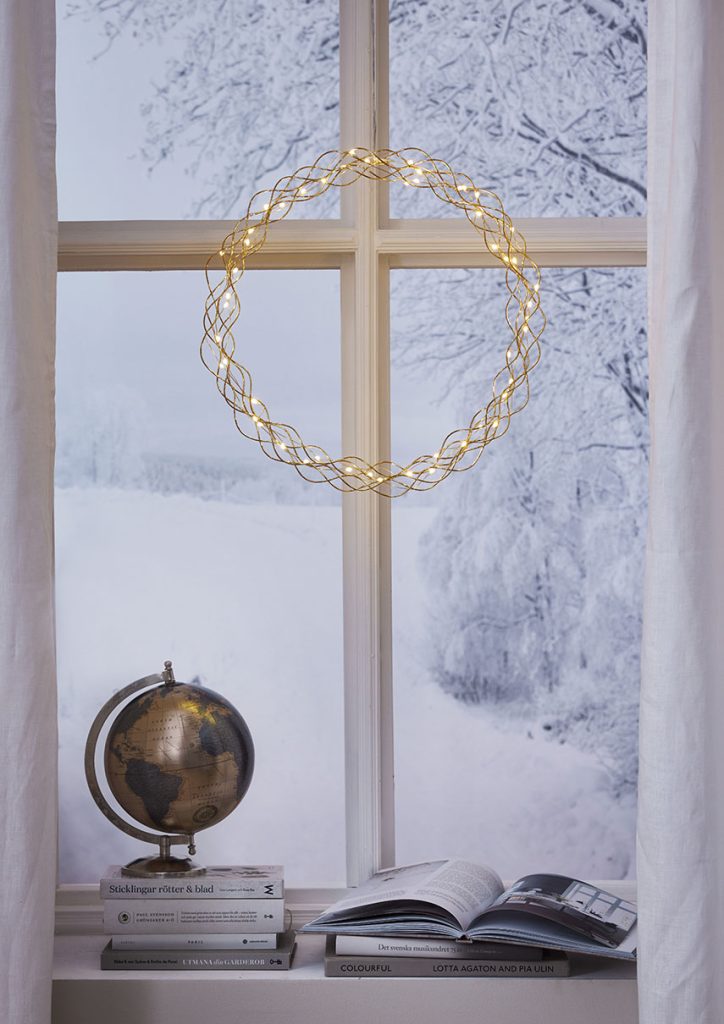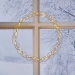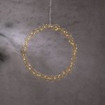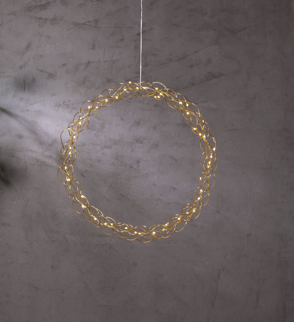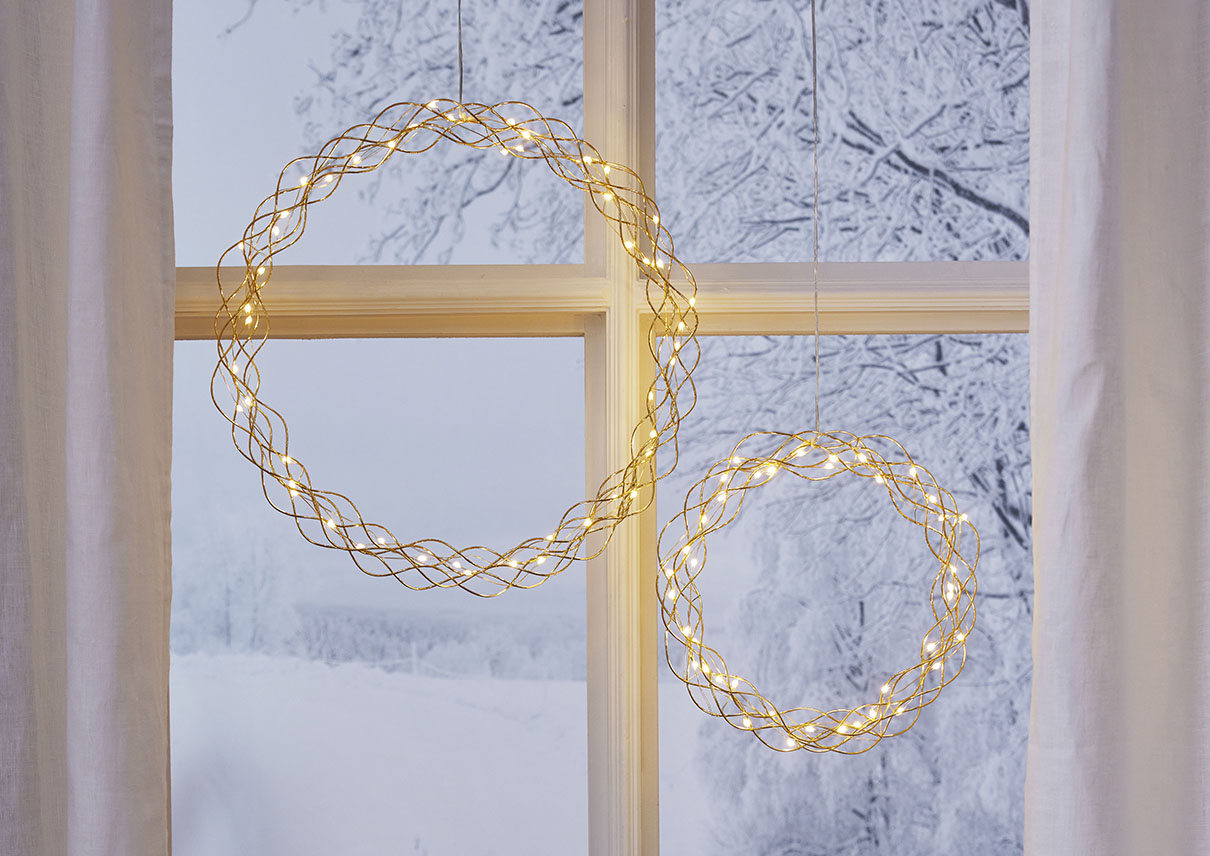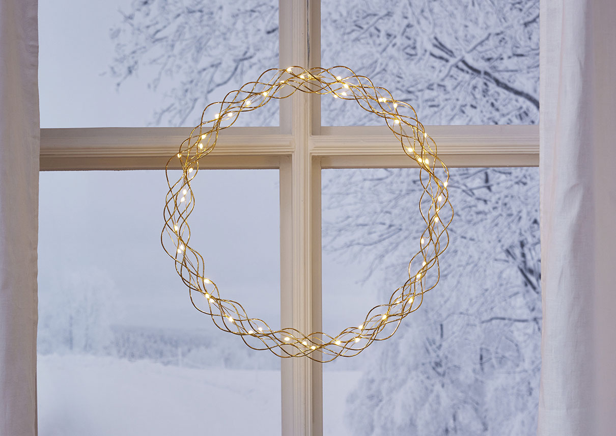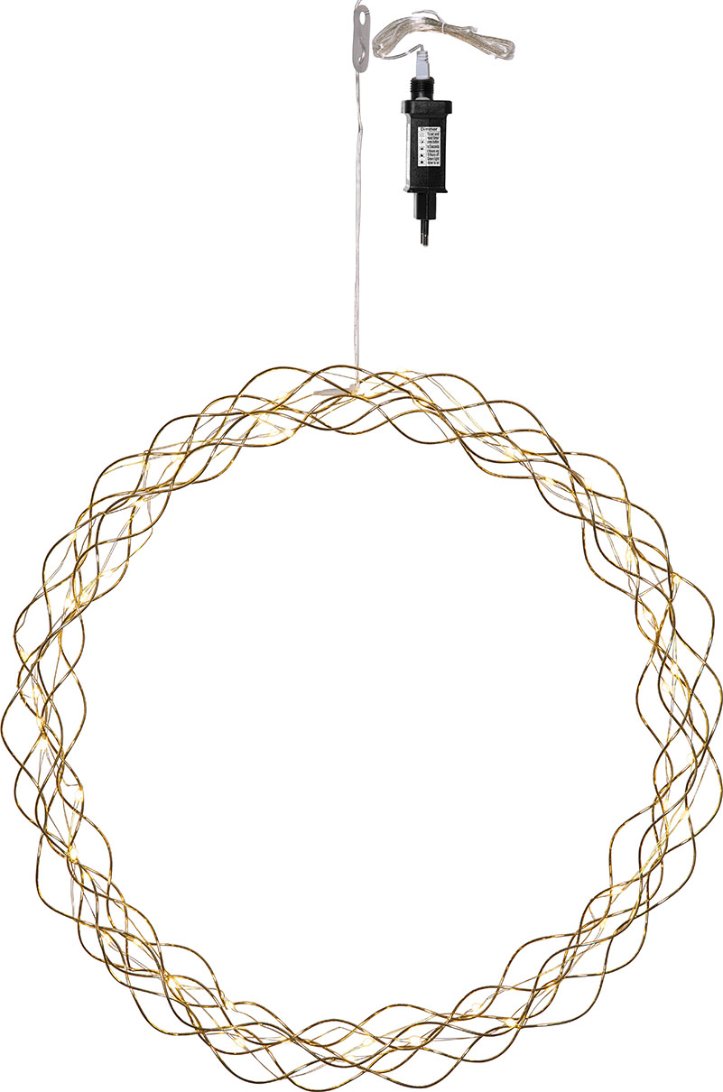 Koristeellinen messingin värinen metallikranssi dew drop-valoilla. Kranssissa on 50 LED-valopistettä, joissa on lämpimän valkoinen valo. Kaunis koriste, jonka voi ripustaa esimerkiksi ikkunaan.