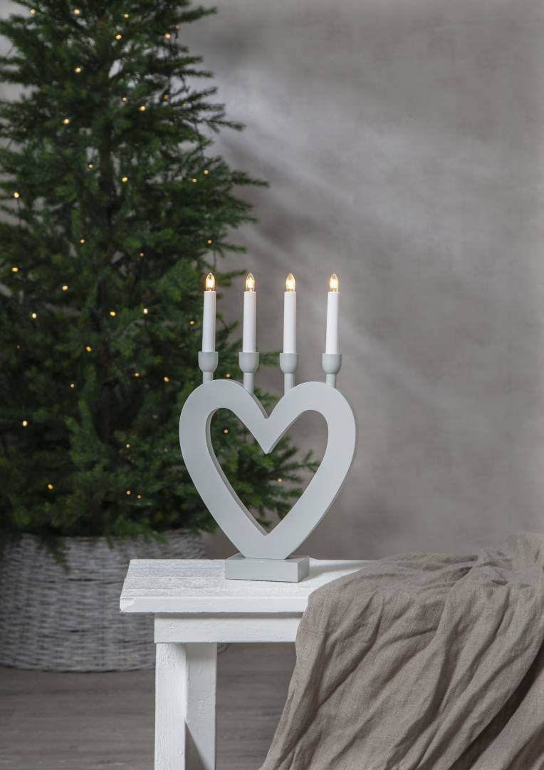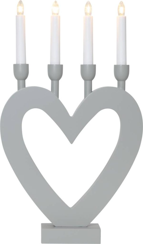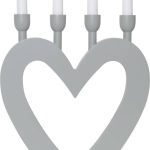 Harmaa sydämen muotoinen puukynttelikkö neljällä kynttilällä. Kynttelikkö sopii täydellisesti ikkunalaudalle tai lipaston päälle luomaan jouluista tunnelmavalaistusta.