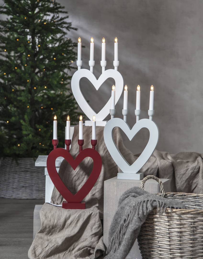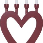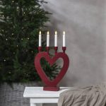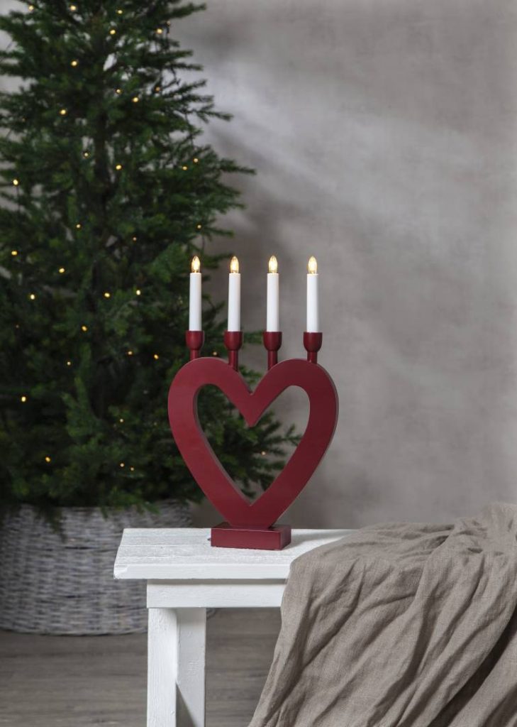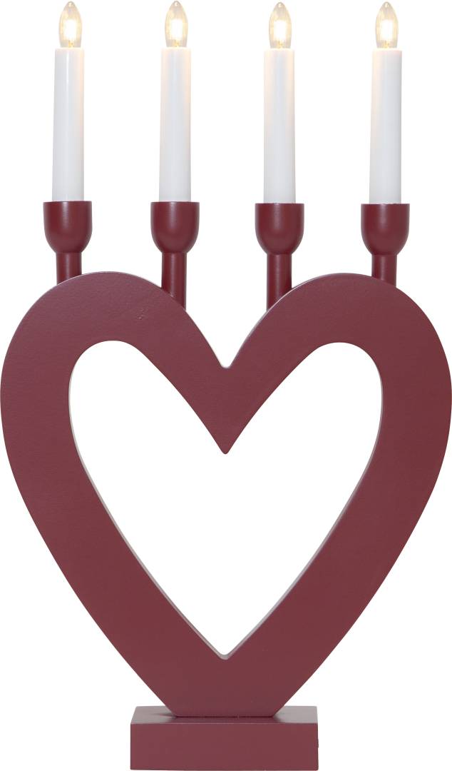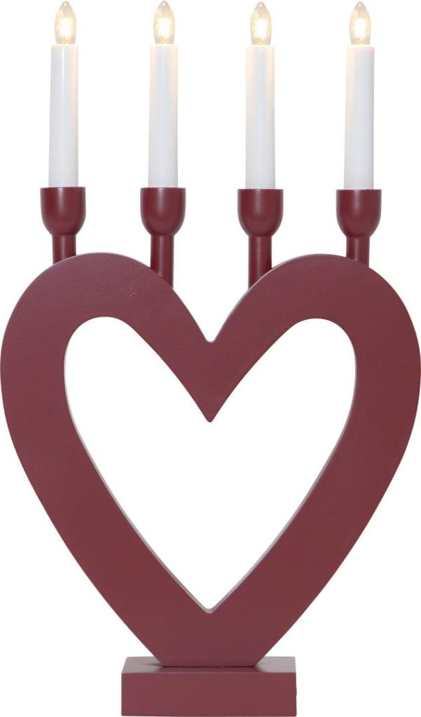 Punainen sydämen muotoinen puukynttelikkö neljällä kynttilällä. Kynttelikkö sopii täydellisesti ikkunalaudalle tai lipaston päälle luomaan jouluista tunnelmavalaistusta.