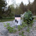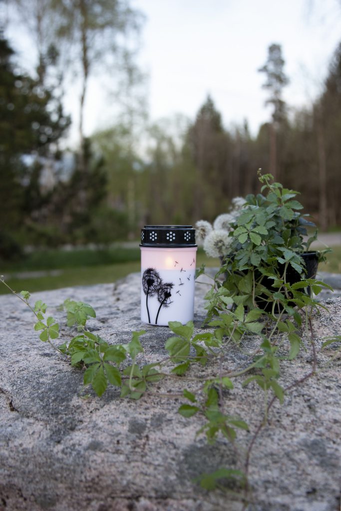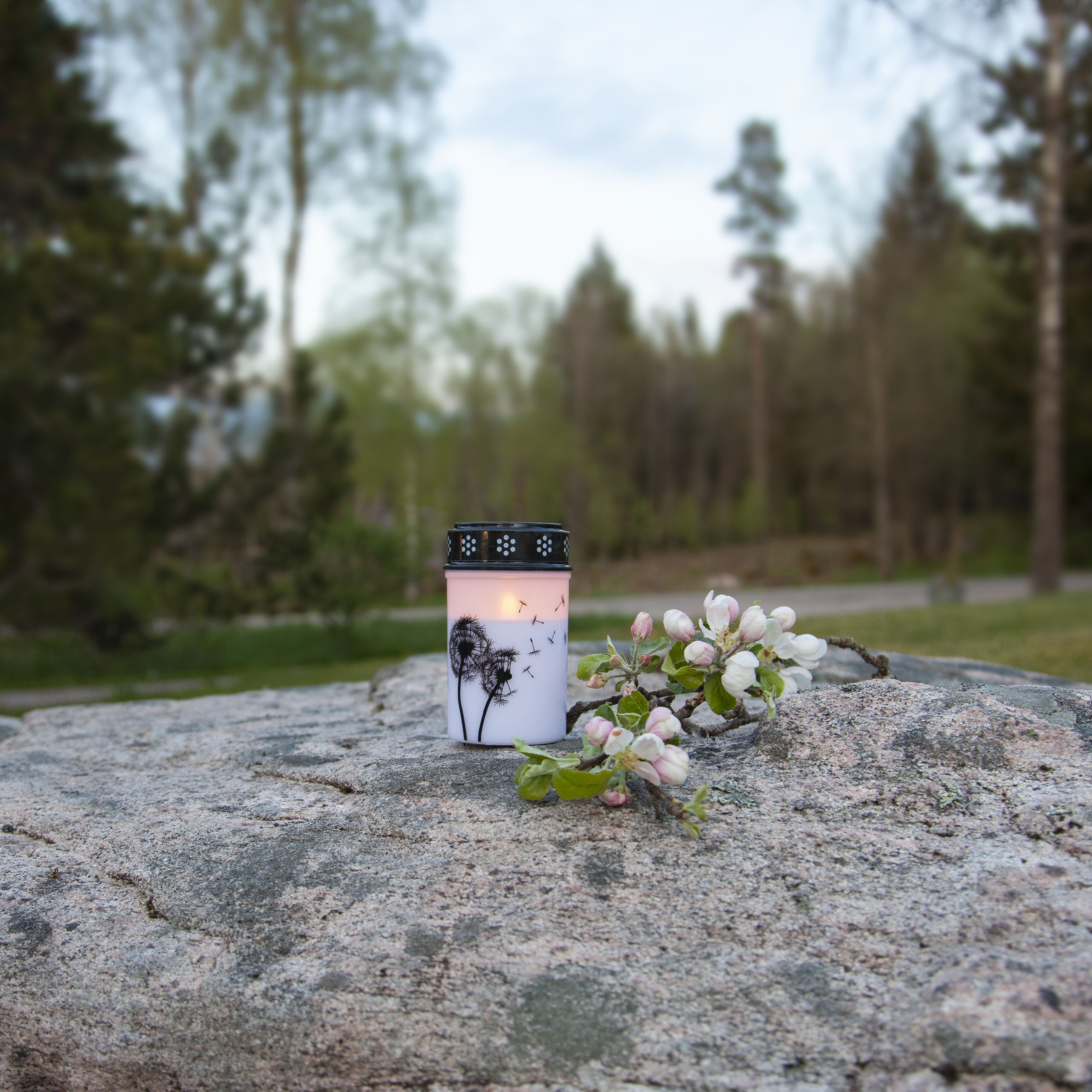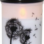 LED-hautakynttilä, jossa on kuva tuulen mukana lentävistä voikukan siemenistä.