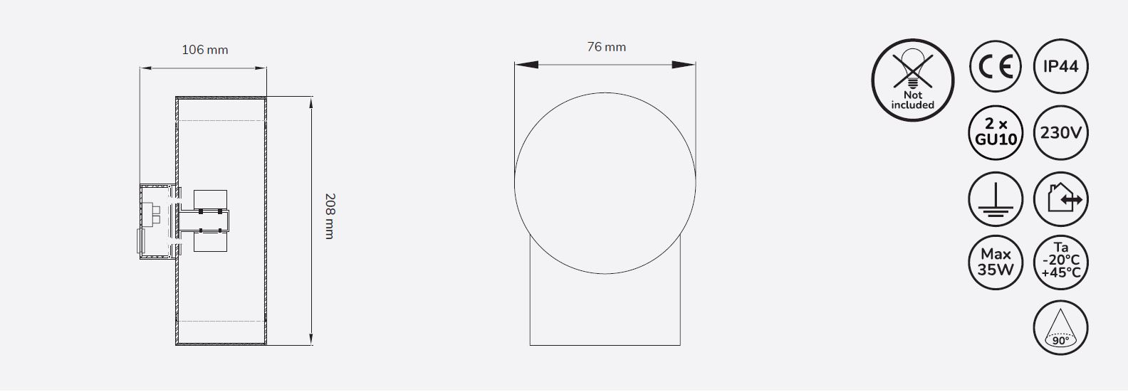 IP44. 2 x GU10. Ei sisällä valonlähteitä.