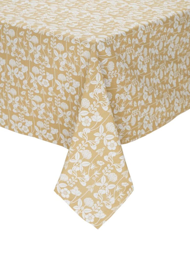 Pöytäliina puuvillaa painetulla kuvioinnilla. Kuvio ’De Mina’ esiintyy joidenkin Carl Larssonin kirjojen alkulehdillä, muun muassa kirjassa ’De mina’.