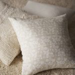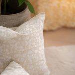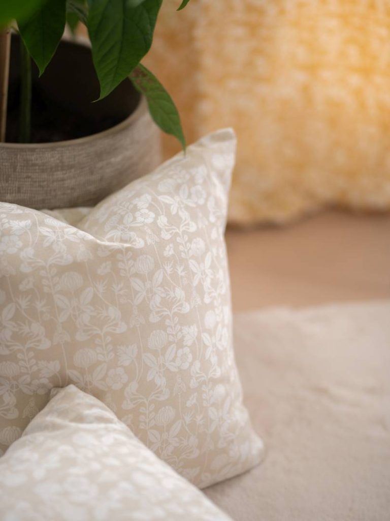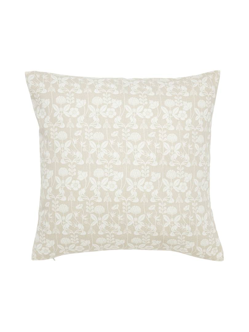 Tyynynpäällinen puuvillaa painetulla kuvioinnilla. Kuvio ’De Mina’ esiintyy joidenkin Carl Larssonin kirjojen alkulehdillä, muun muassa kirjassa ’De mina’. Tyynynpäällisessä on vetoketju alareunassa.