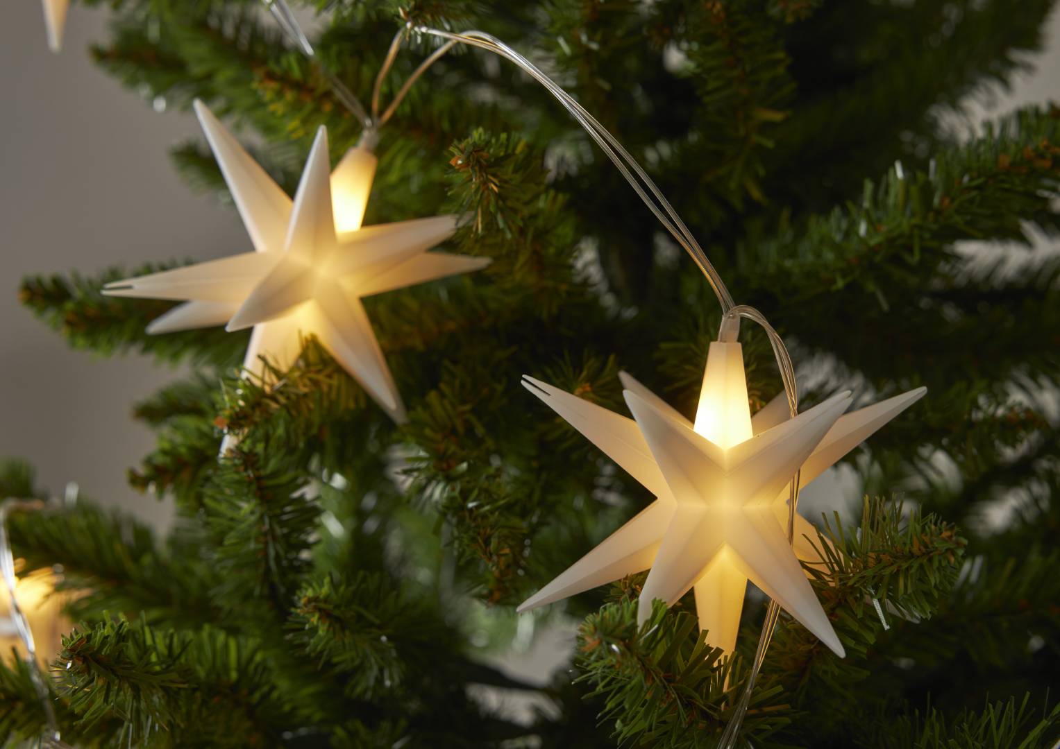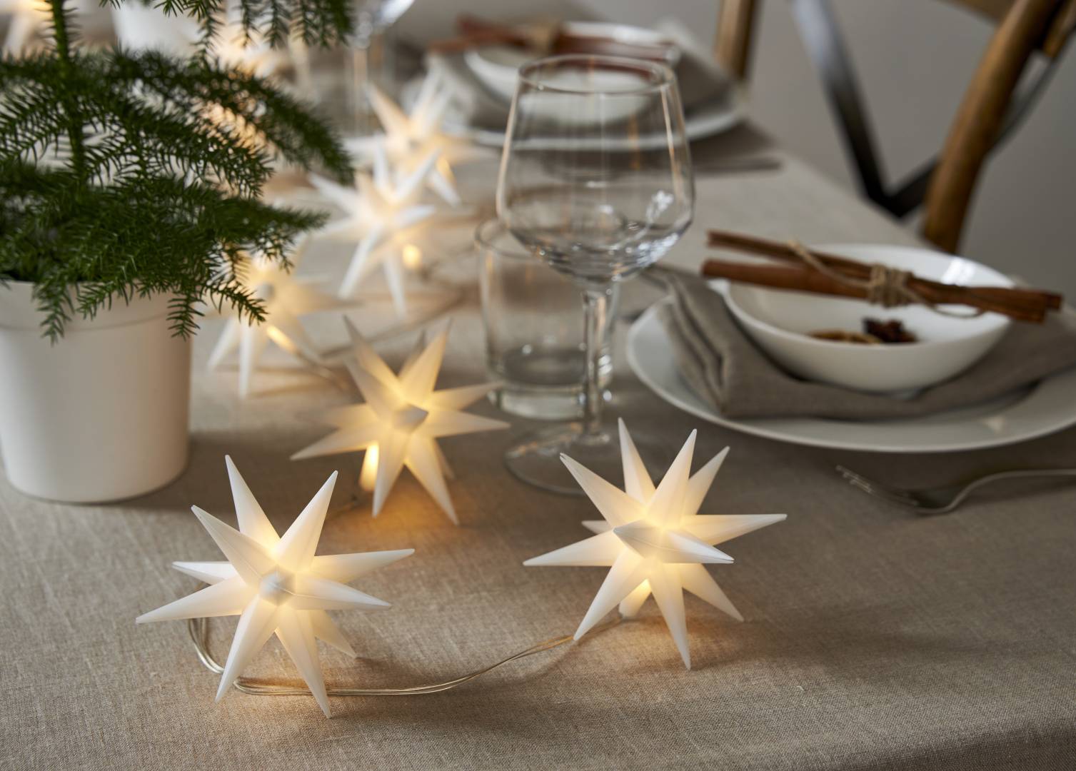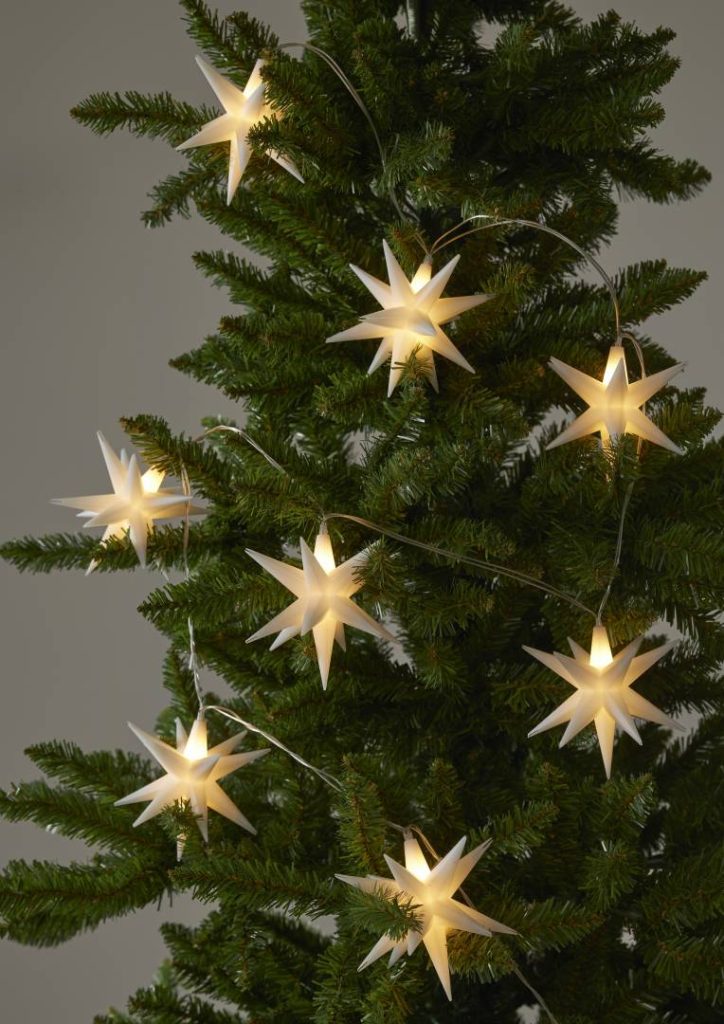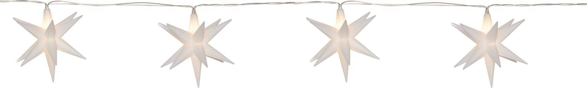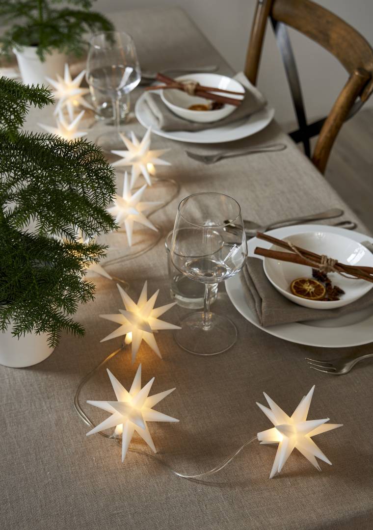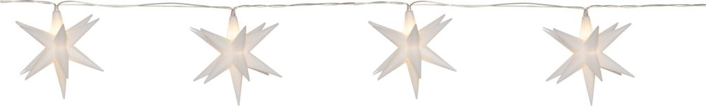 210 cm pitkä valosarja, jossa 8 valkoista kolmiulotteista Moravian-tähteä lämpimän valkoisilla LED-valoilla. Sisäkäyttöön.