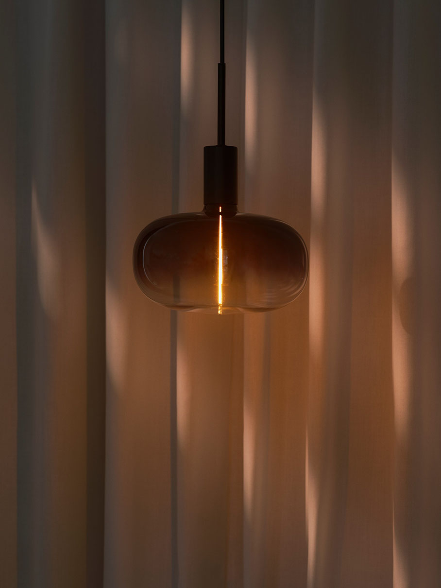 Tämä ylisuuri koristeellinen savulasilamppu luo elegantin katseenvangitsijan, yhdistettiinpä se sitten yksinkertaiseen lampunpidikkeeseen tai minimalistiseen valaisimeen. Lamppu on himmennettävä.
