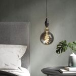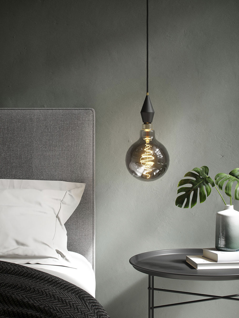 Koristeellinen LED-lamppu savunharmaalla lasilla. E27, värilämpötila 1800K, valovirta 200 lm. Lamppu on himmennettävä.