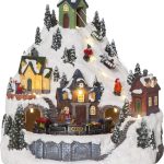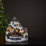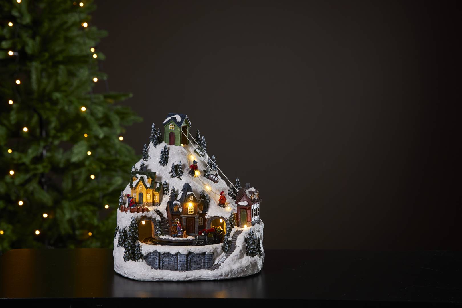 Pöytäkoriste, jonka talvisessa maisemassa on hiihtohissi, luistelijoita, juna-asema ja liikkuva juna. Lunta ja asemaa valaisevat kauniisti 11 pientä lämpimän valkoista LED-valopistettä. Sopii esimerkiksi lastenhuoneeseen tai lipaston päälle jouluiseksi koristeeksi.