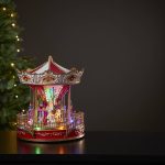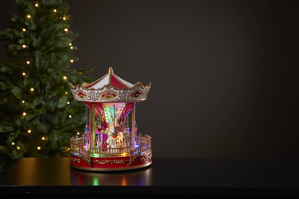 Pöytäkoristeeksi sopiva värikäs karuselli, joka pyörii ympäri ja soittaa kahdeksaa eri joulusävelmää. Karusellia valaisevat 16 pientä moniväristä LED-valoa. Sijoita esimerkiksi pöydälle tuomaan kotiisi värikästä joulutunnelmaa.
