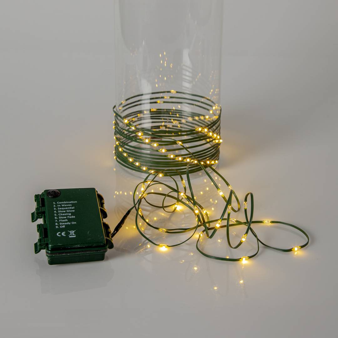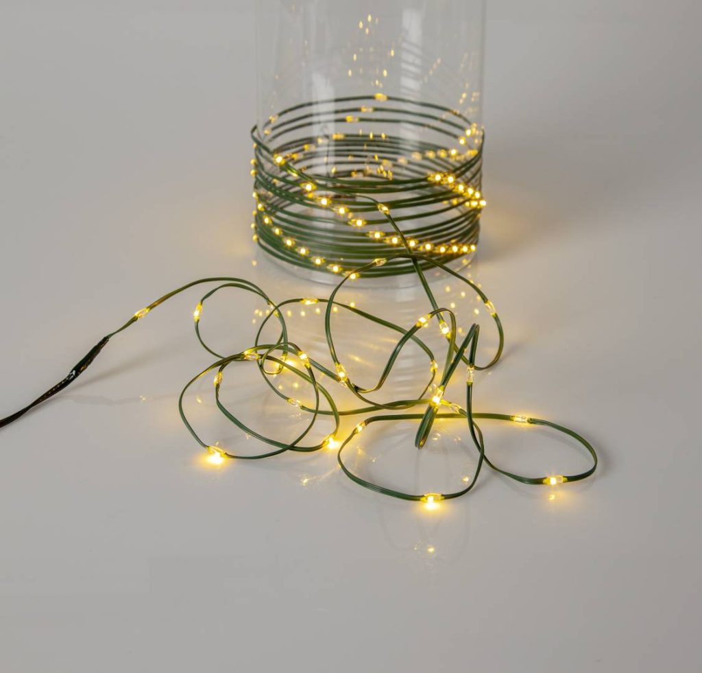 7,2 m pitkä, ulkokäyttöön sopiva paristoilla toimiva valosarja, jossa litteässä, vihreän värisessä kaapelissa on 96 lämpimän valkoista valoa. Sopii esim. puiden, pensaiden, kranssien ja kaiteiden koristeluun. Taipuisa kaapeli.