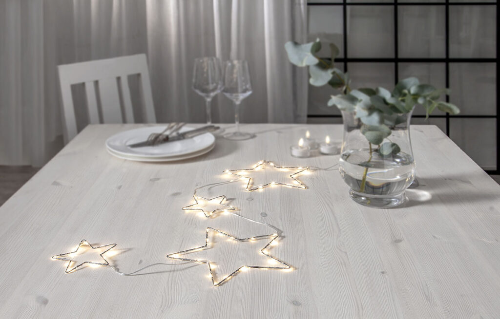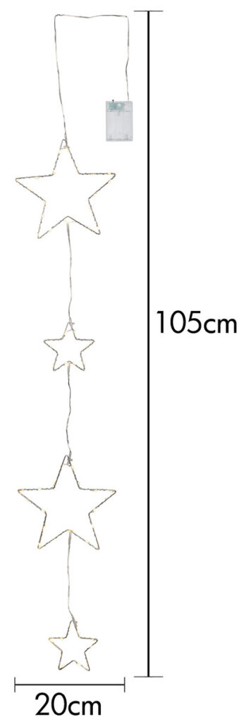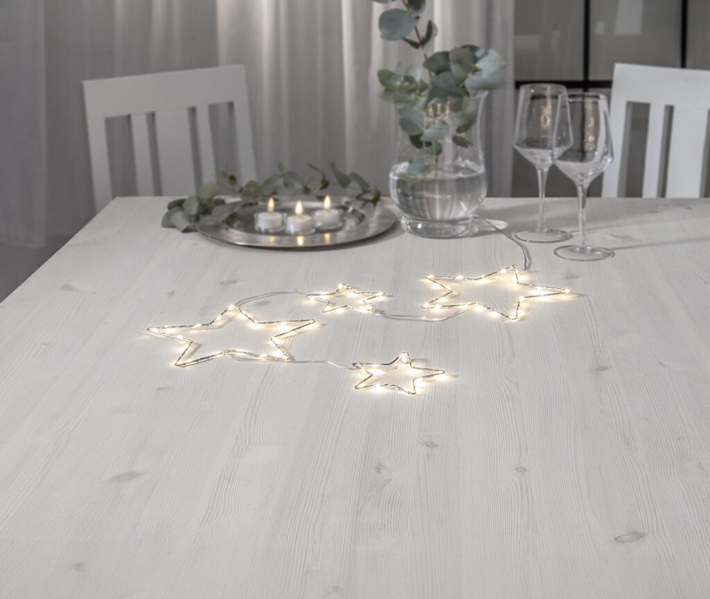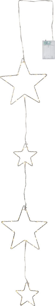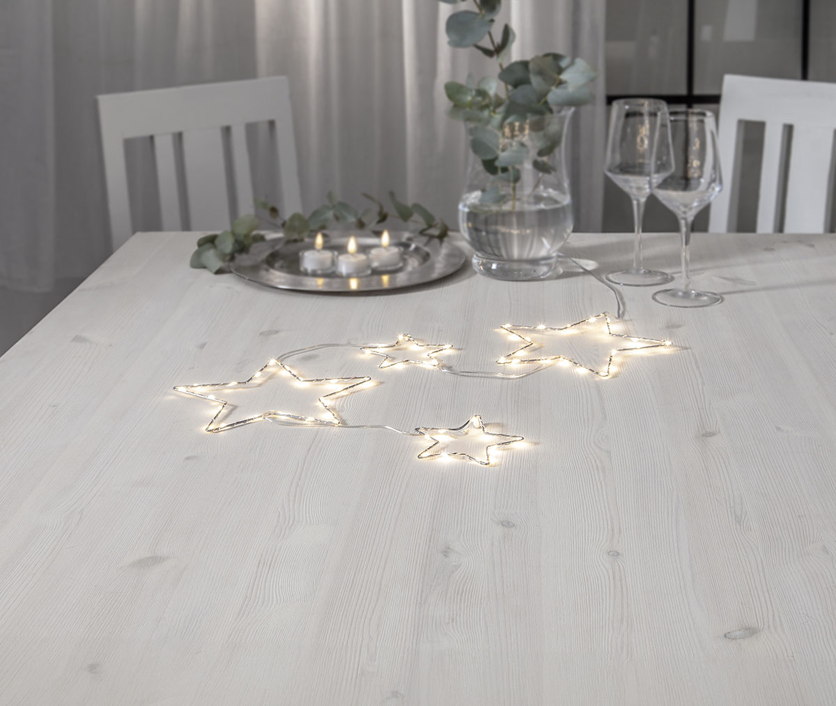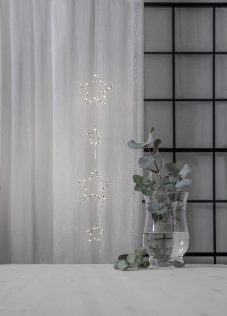 Paristokäyttöinen valosarja sisäkäyttöön. Isommassa, 20 cm leveässä tähdessä on 20 lämpimän valkoista LED-valoa ja pienemmässä, 10 cm leveässä tähdessä 10 valoa. Sopii sekä ripustettavaksi koristeeksi että esim. pöydälle.