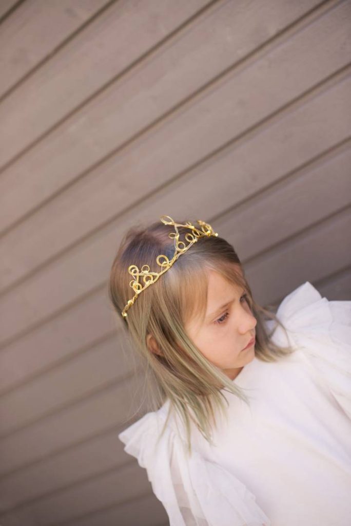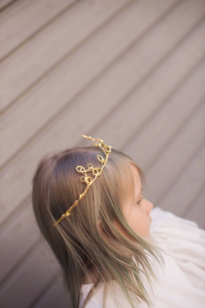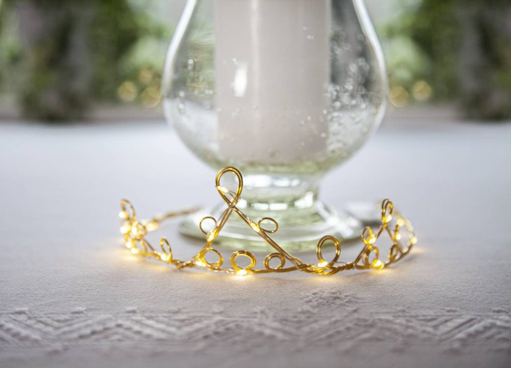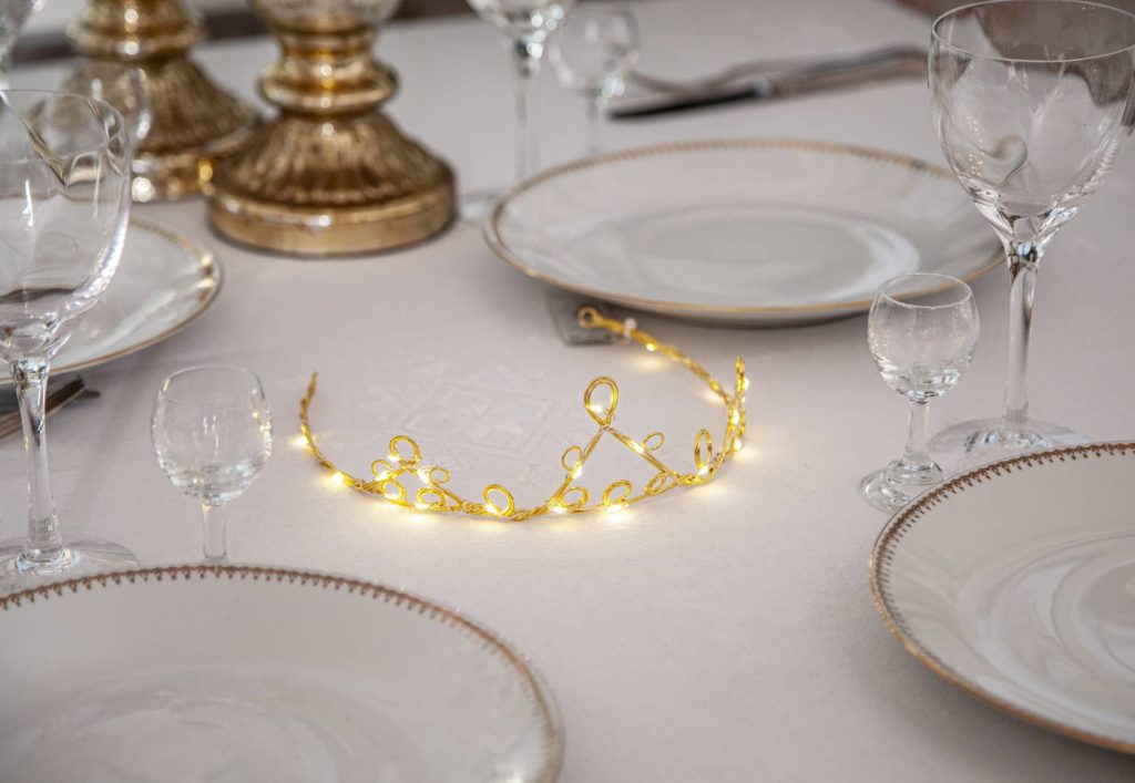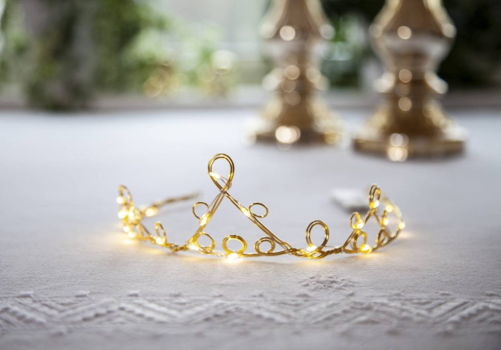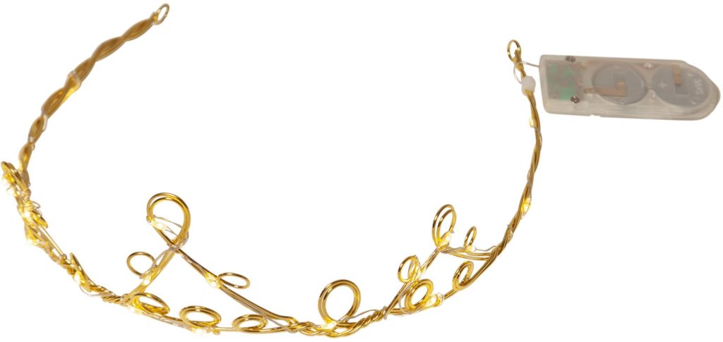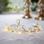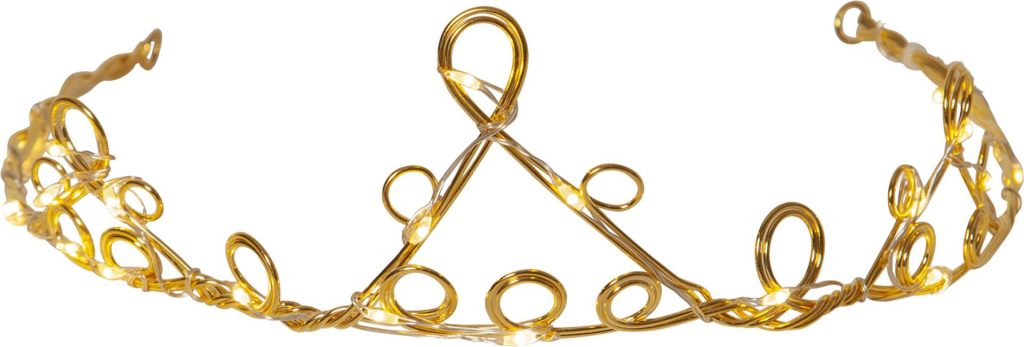 Messingin värinen paristokäyttöinen tiara-koriste sisäkäyttöön. Sopii esimerkiksi