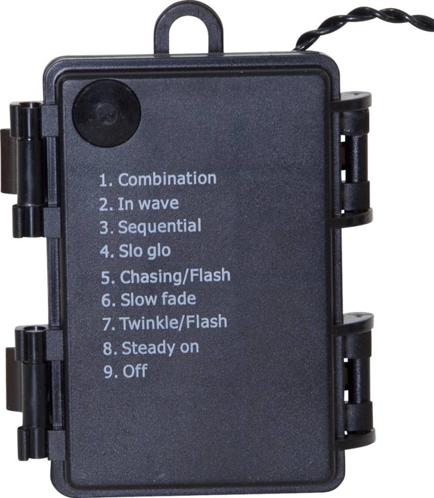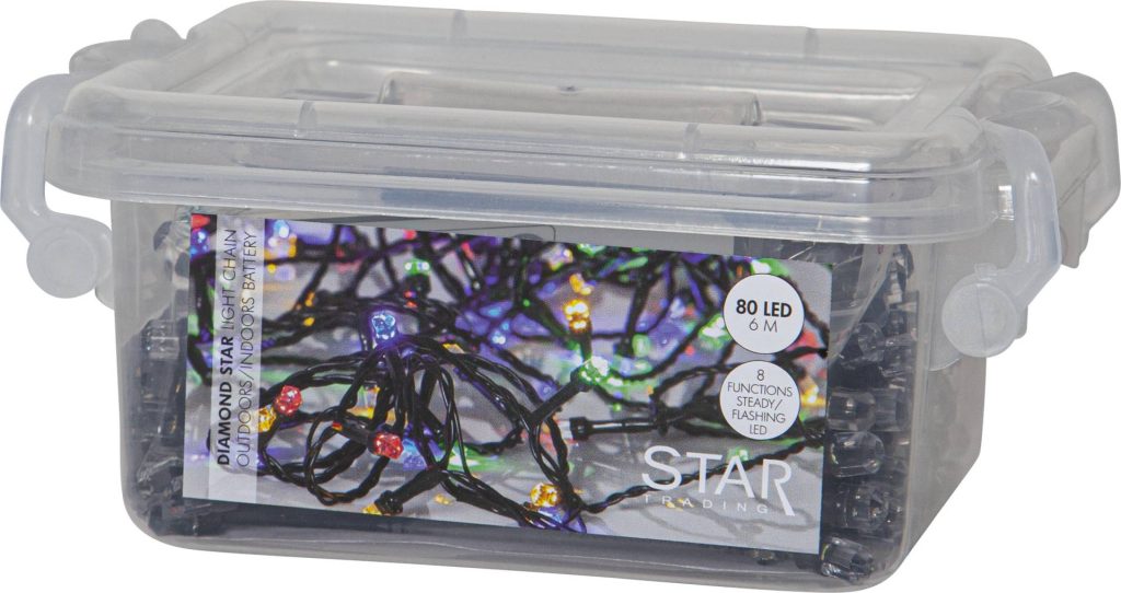 Ulkokäyttöön sopiva paristokäyttöinen 6 m pitkä valosarja, jossa on 80 värikästä LED-valoa mustassa kaapelissa. Valoissa on kaunis tähtiheijastus. Sopii esimerkiksi puutarhan tai joulukuusen koristeluun. Valosarjassa on 8 toimintoa: erilaiset vilkkumisefektit tai tasaisesti palava valo.