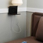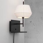 Seinävalaisin metallia, puuvillainen vekkivarjostin. Valaisimessa on pieni hylly tavaroiden säilytykseen ja USB-portti mobiililaitteiden lataamiseen.