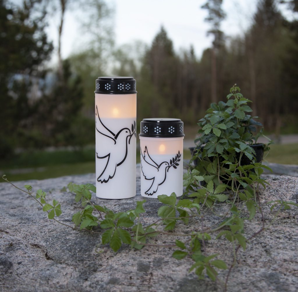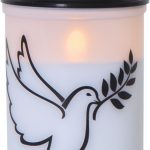 LED-hautakynttilä, jossa on kuva lentävästä kyyhkysestä.