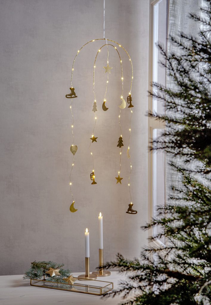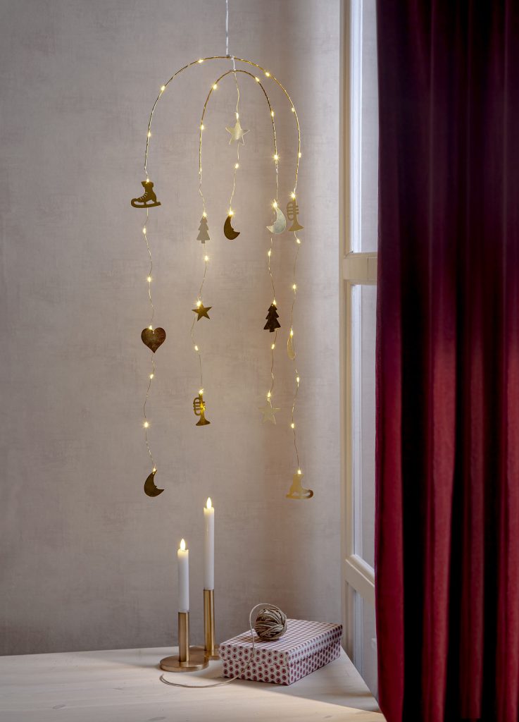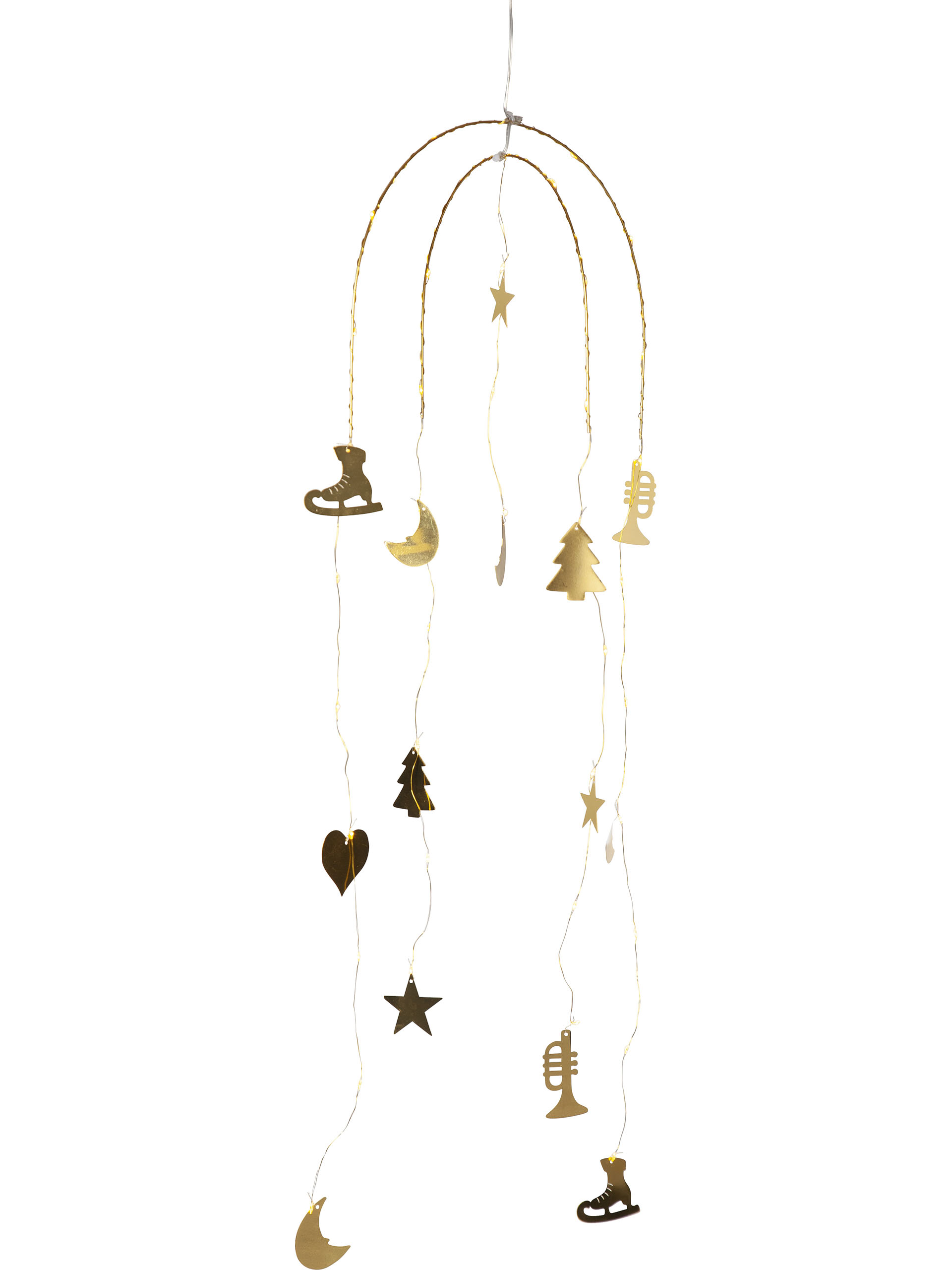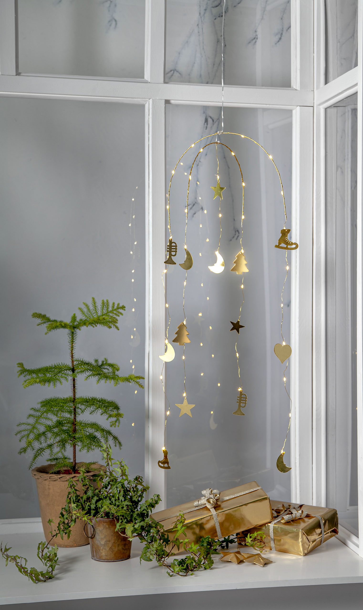 Koristeellinen talviaiheinen mobile LED-valoilla. Messingin värinen koriste sopii sisäkäyttöön tuomaan jouluista tunnelmaa. Ripusta esimerkiksi ikkunan yläpuolelle tai pimeää nurkkaa valaisemaan. Pitkä johto paristokoteloon.