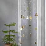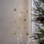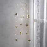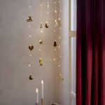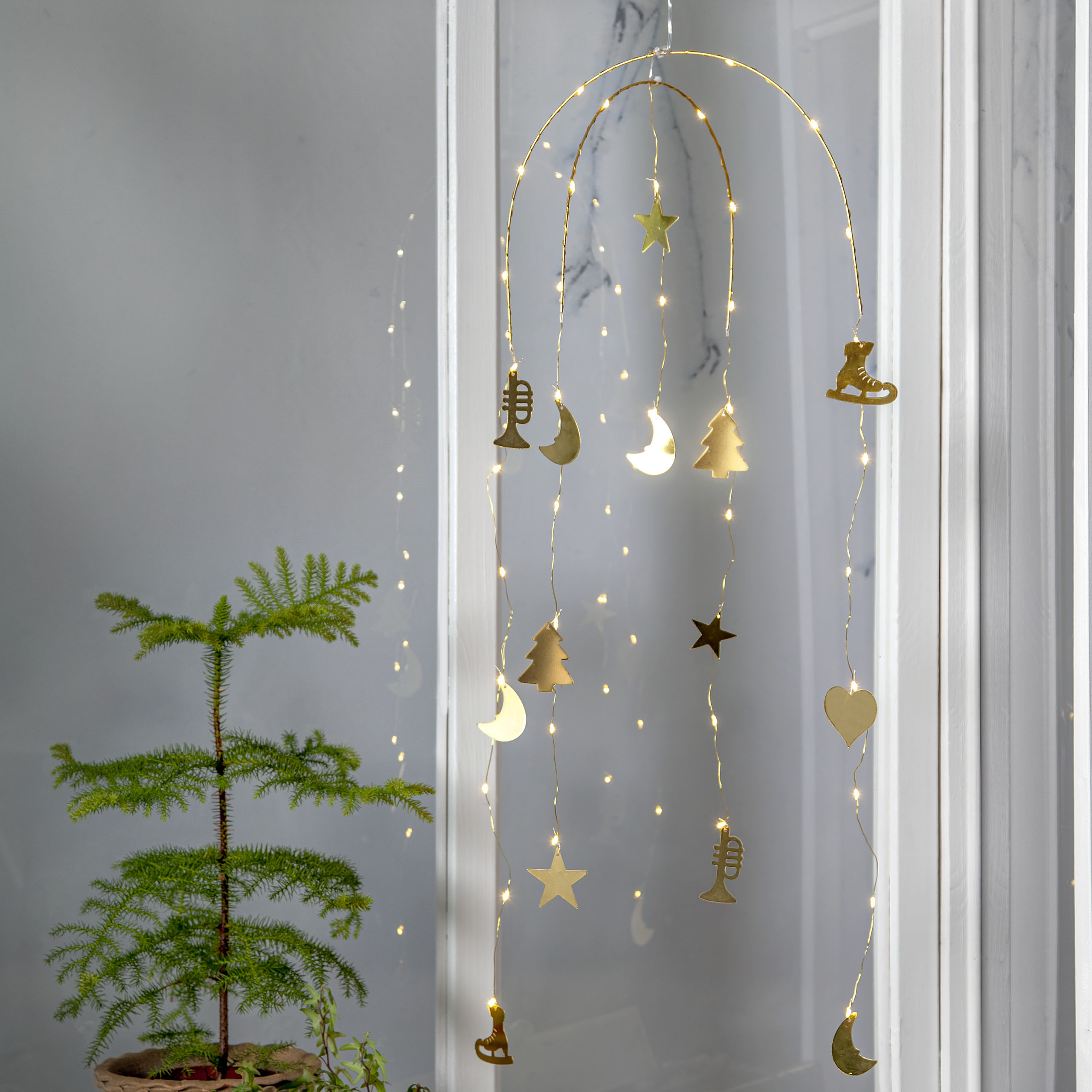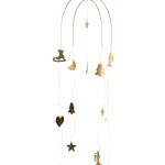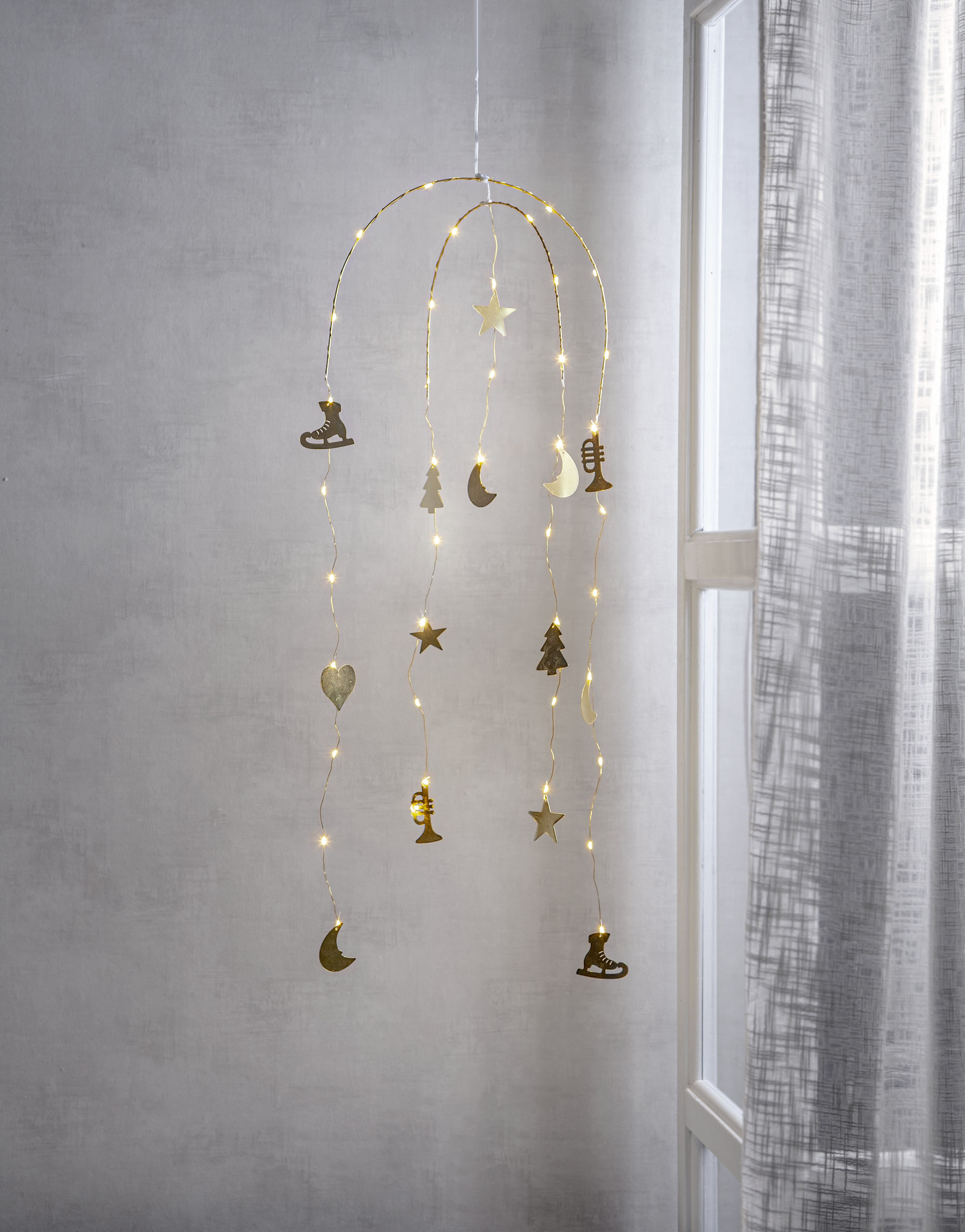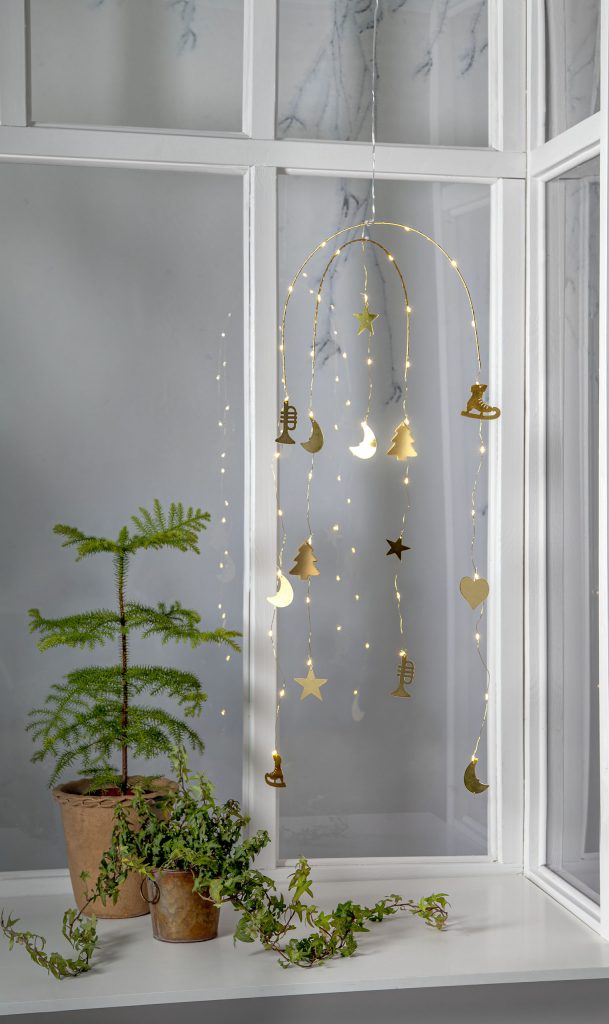 Koristeellinen talviaiheinen mobile LED-valoilla. Messingin värinen koriste sopii sisäkäyttöön tuomaan jouluista tunnelmaa. Ripusta esimerkiksi ikkunan yläpuolelle tai pimeää nurkkaa valaisemaan. Pitkä johto paristokoteloon.