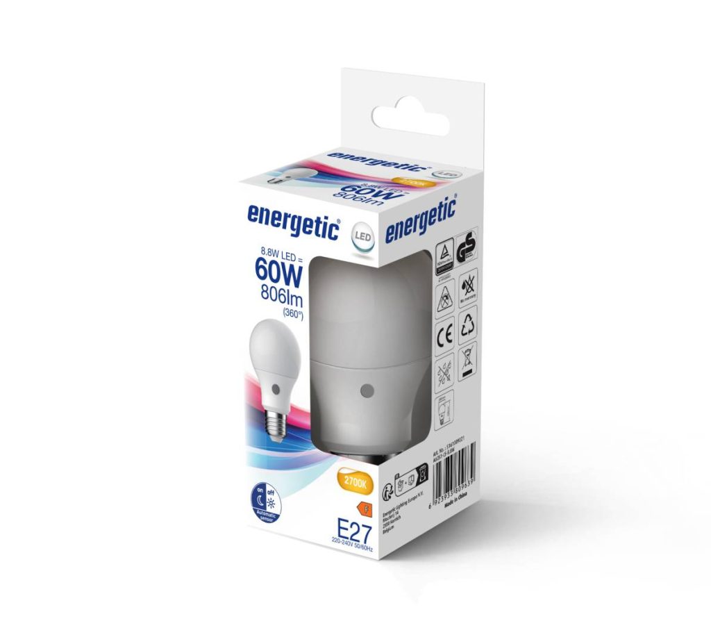 LED-lamppu opaalilla muovikuvulla ja hämäräsensorilla. Syttyy, kun valoisuus on alle 300 luksia. Vastaa 60W hehkulamppua.