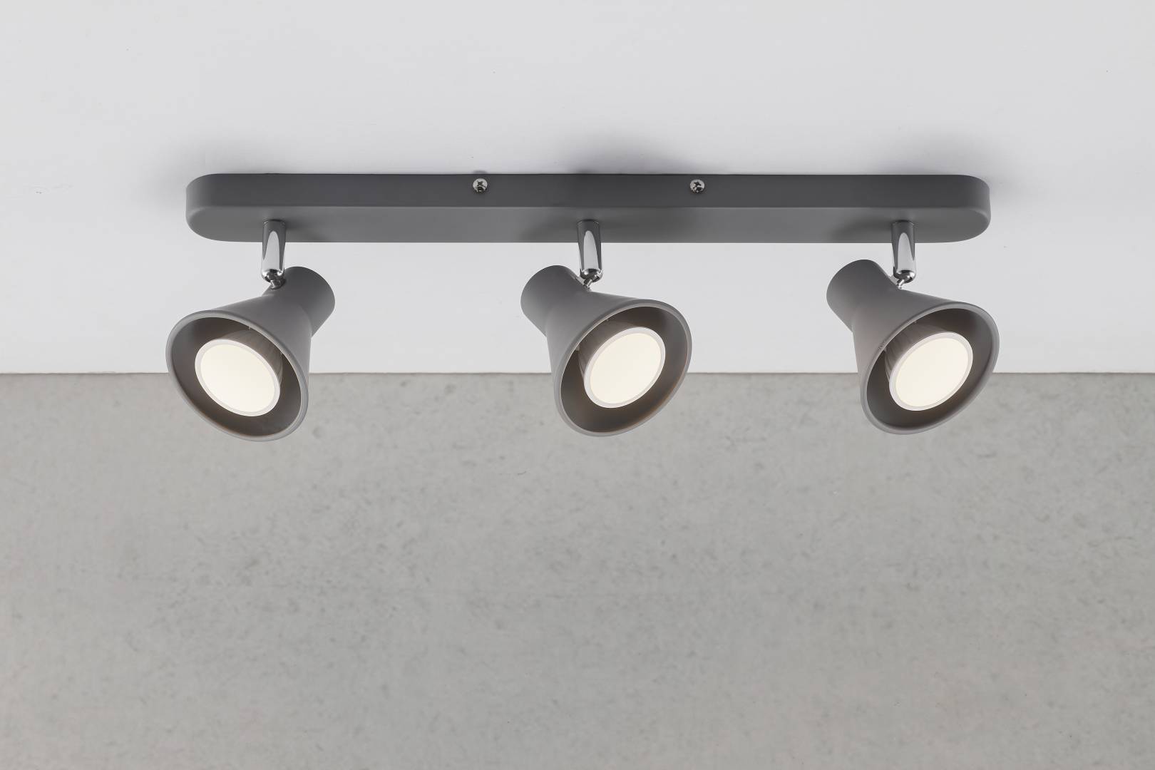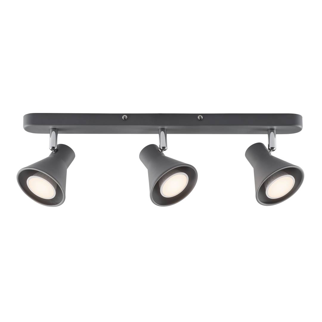 Pelkistetty, moderni 3-osainen spottivalaisin harmaata metallia. Sopii moniin eri sisustustyyleihin. Varjostimien suunta on säädettävissä. Valaisimen voi asentaa joko seinään tai kattoon.