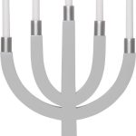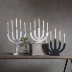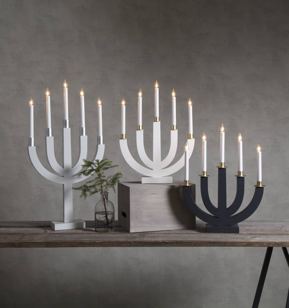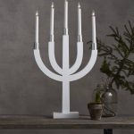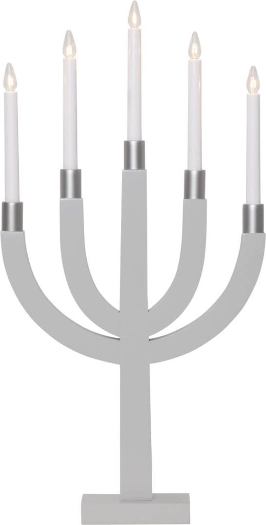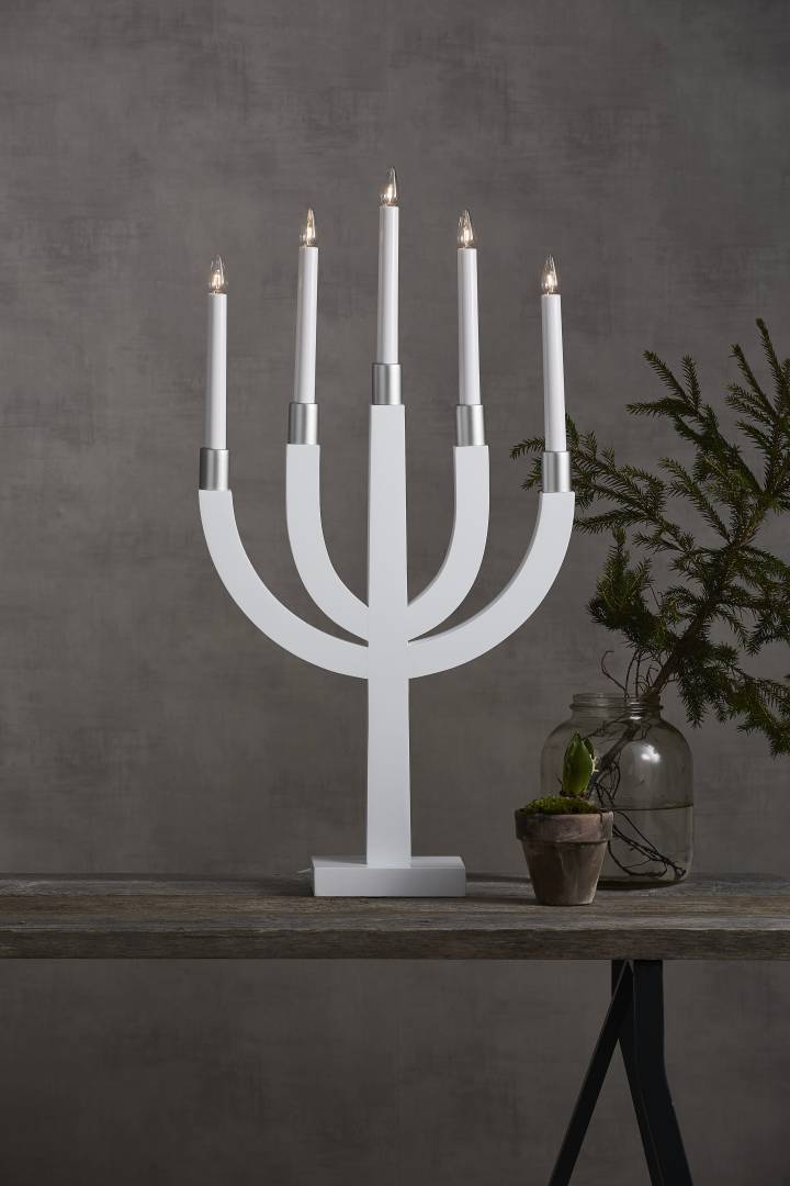 Puinen kynttelikkö, jossa 5 vaihdettavaa E10-kantaista lamppua ja hopean väriset yksityiskohdat.