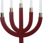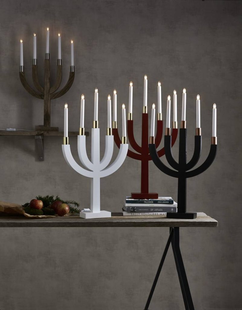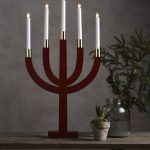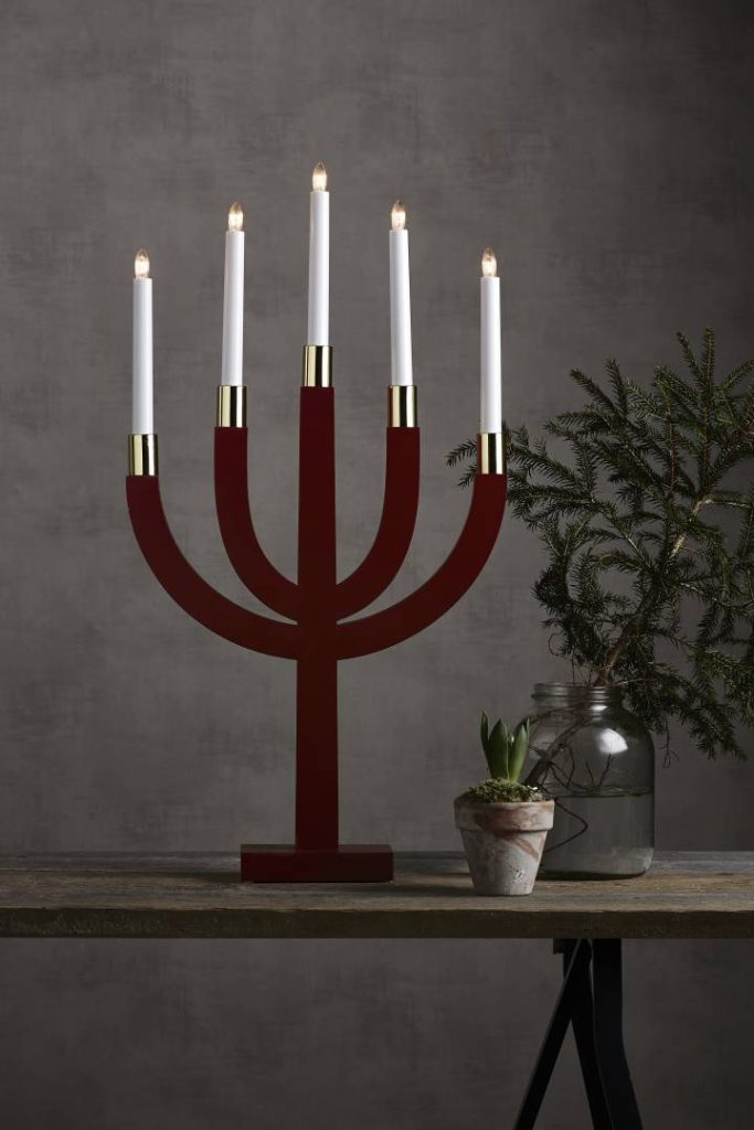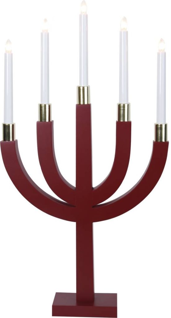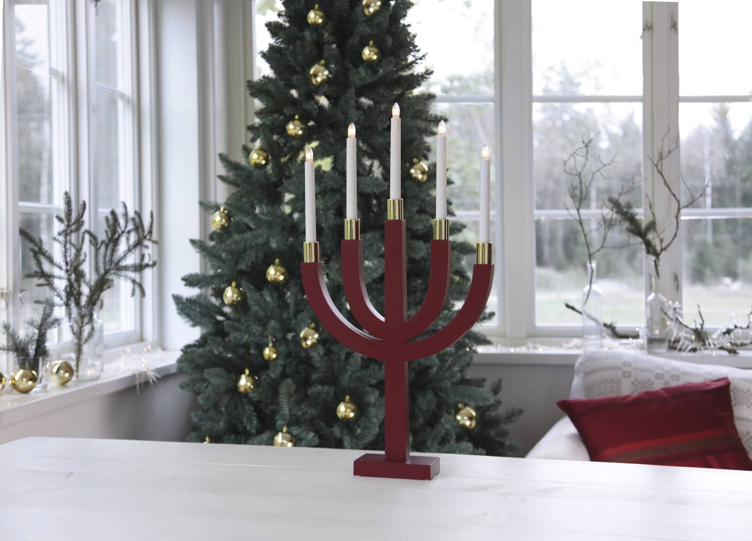 Puinen kynttelikkö, jossa 5 vaihdettavaa E10-kantaista lamppua ja messingin väriset yksityiskohdat.
