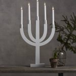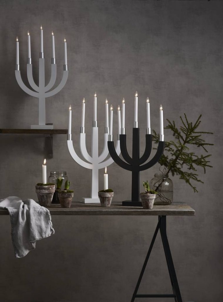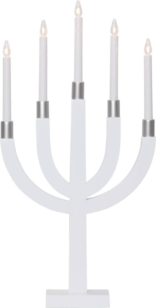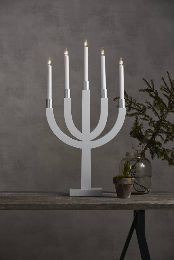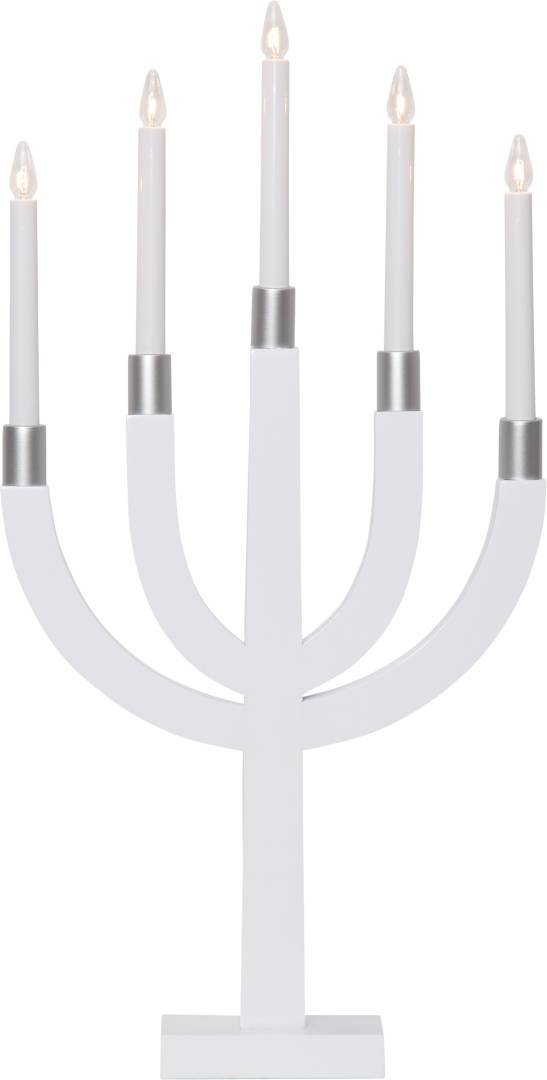 Puinen kynttelikkö, jossa 5 vaihdettavaa E10-kantaista lamppua ja hopean väriset yksityiskohdat. Aseta esimerkiksi lipastolle tai ikkunalaudalle tuomaan tunnelmaa joulunaikaan.