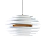 Näyttävä riippuvalaisin mattavalkoista ja messingin väristä metallia.