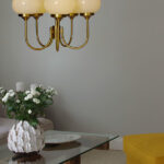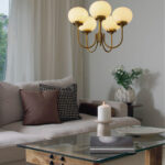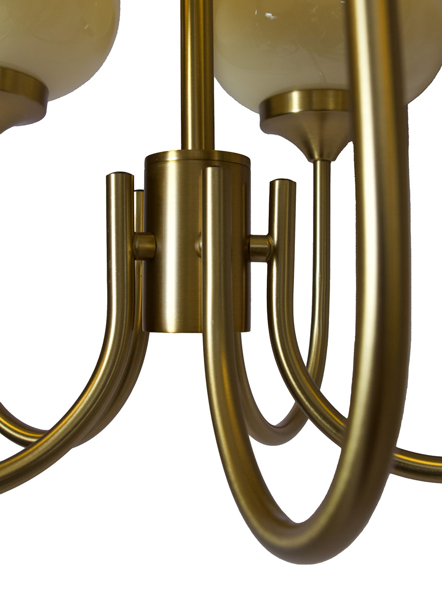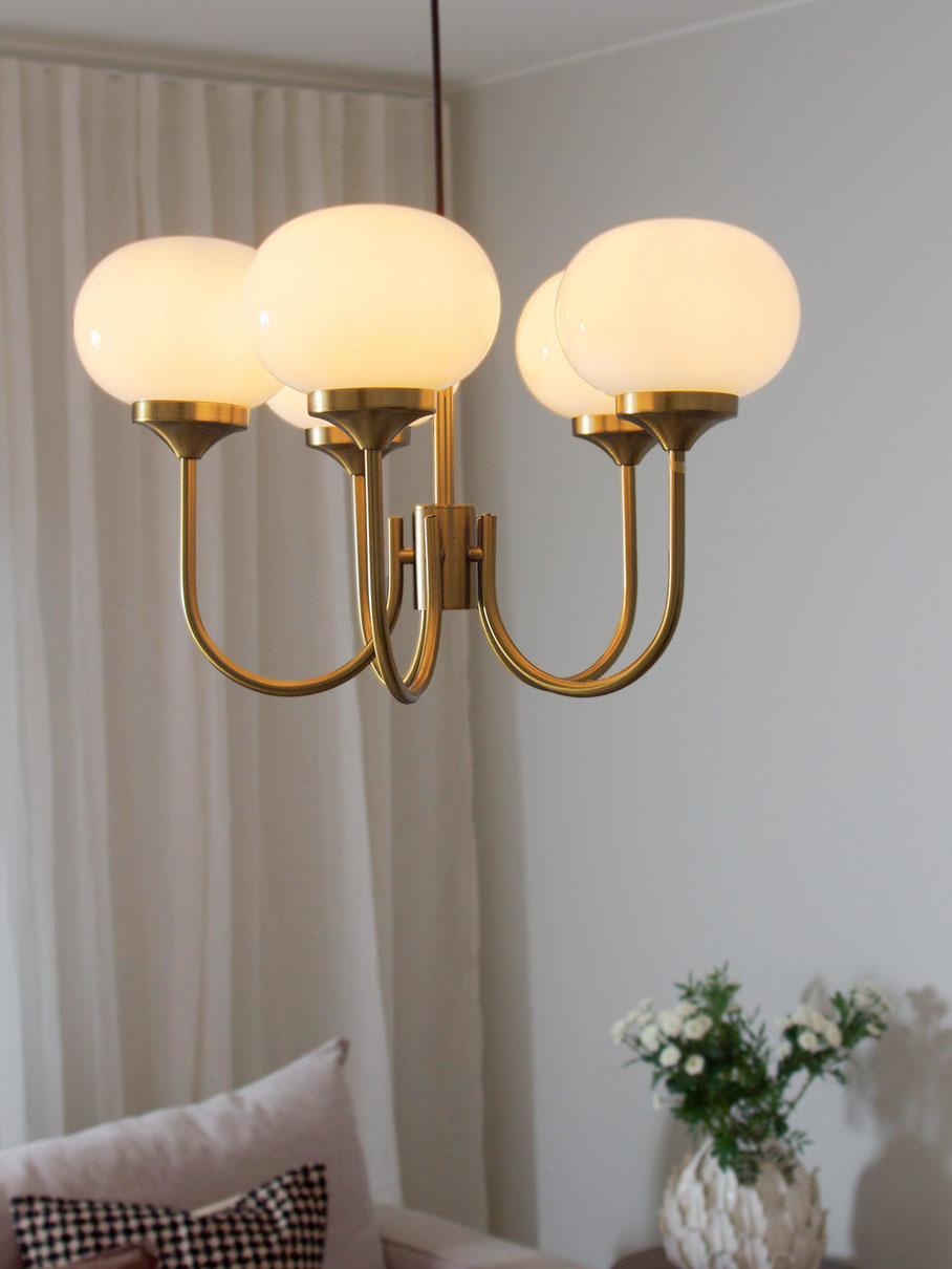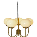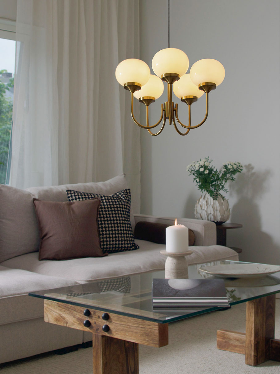 Piristä huonetta Elsy-riippuvalaisimella, joka yhdistää klassisen eleganssin moderniin lämpöön. Tässä tyylikkäässä harjatusta messingistä valmistetussa valaisimessa on viisi ylöspäin suuntautuvaa vartta, joista jokaisessa on opaalivalkoinen lasivarjostin, joka heijastaa pehmeää ja kutsuvaa valoa. Lasin lämmin sävy luo viihtyisän tunnelman – täydellinen sekä olohuoneeseen, ruokailutilaan että makuuhuoneeseen, johon haluat lisätä sekä valoa että luonnetta. Kauniisti pyöristetyn muotonsa ja 56 cm:n halkaisijansa ansiosta valaisin on luonnollinen katseenvangitsija huoneessa, mutta se ei vie liikaa huomiota. Halusitpa sitten luoda harmonista valoa ruokapöydän ylle tai antaa eteiseen elegantin ilmeen, tämä kattovalaisin on ajaton valinta, jossa on sekä tyyliä että toimivuutta.