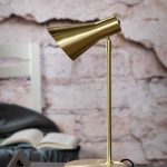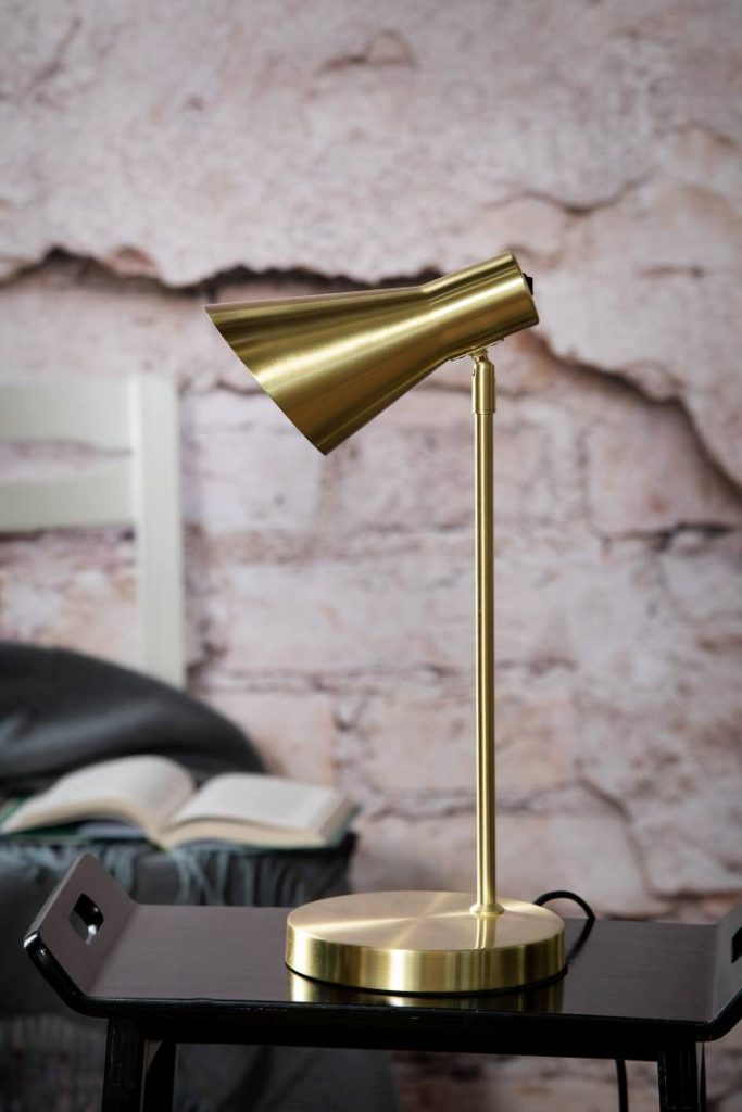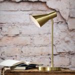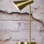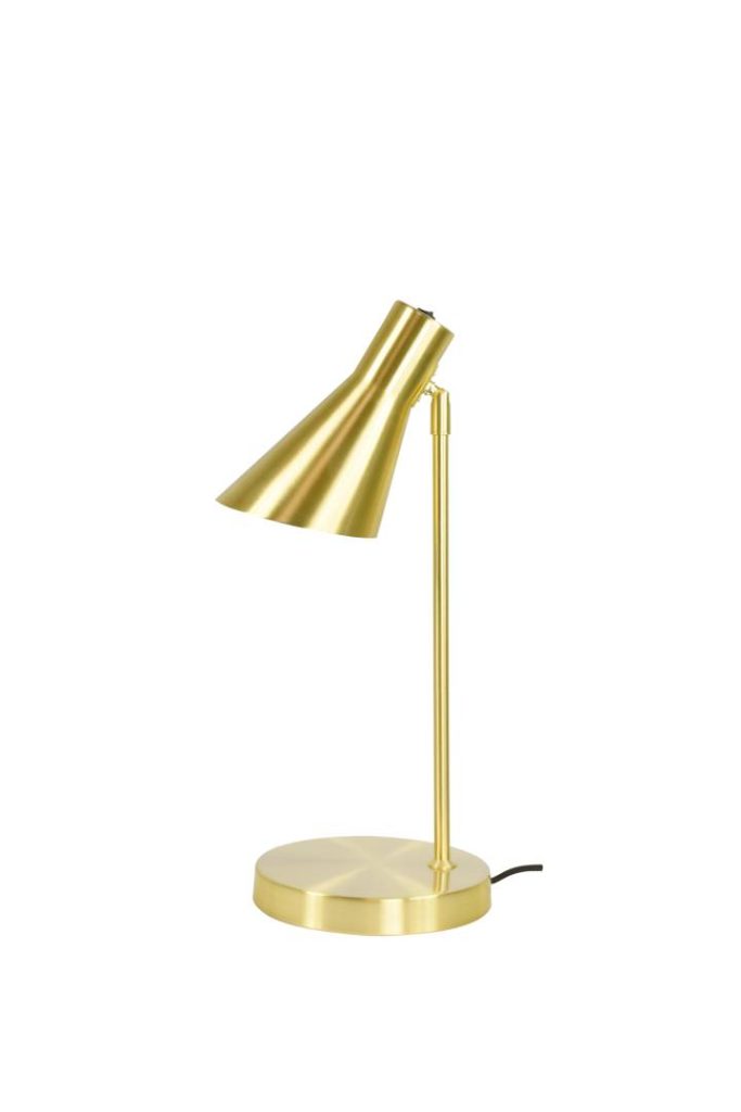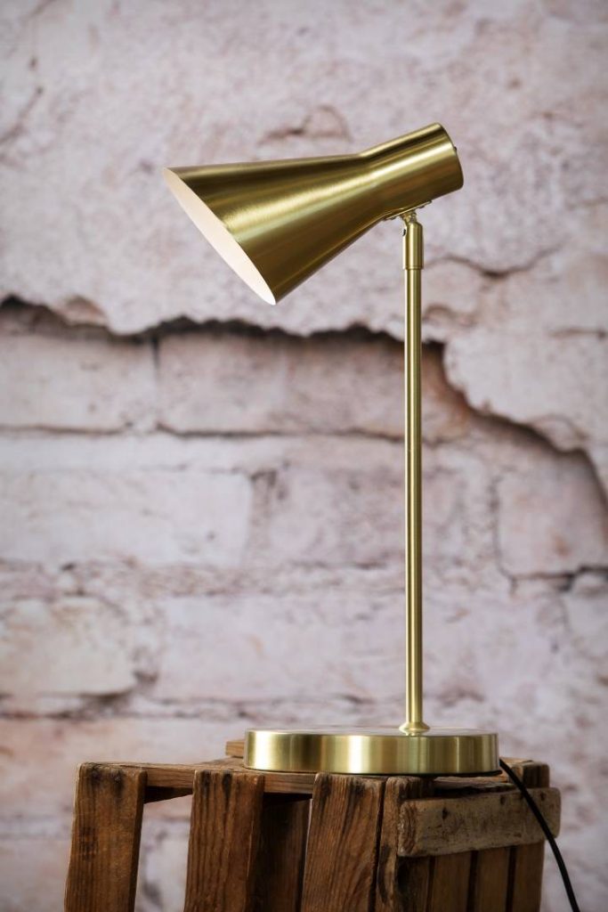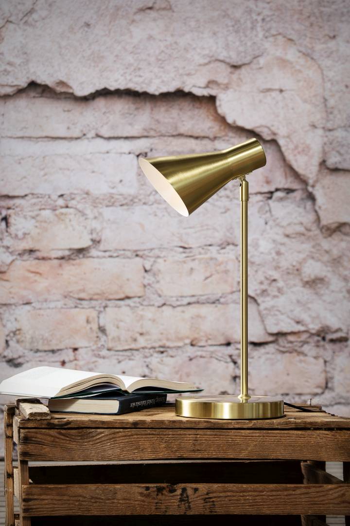 Ajattoman mallinen, tukeva Emil pöytävalaisin messinki. Varjostin säädettävissä pallonivelen ansiosta. Emil-valaisin sopii monentyyliseen sisustukseen.