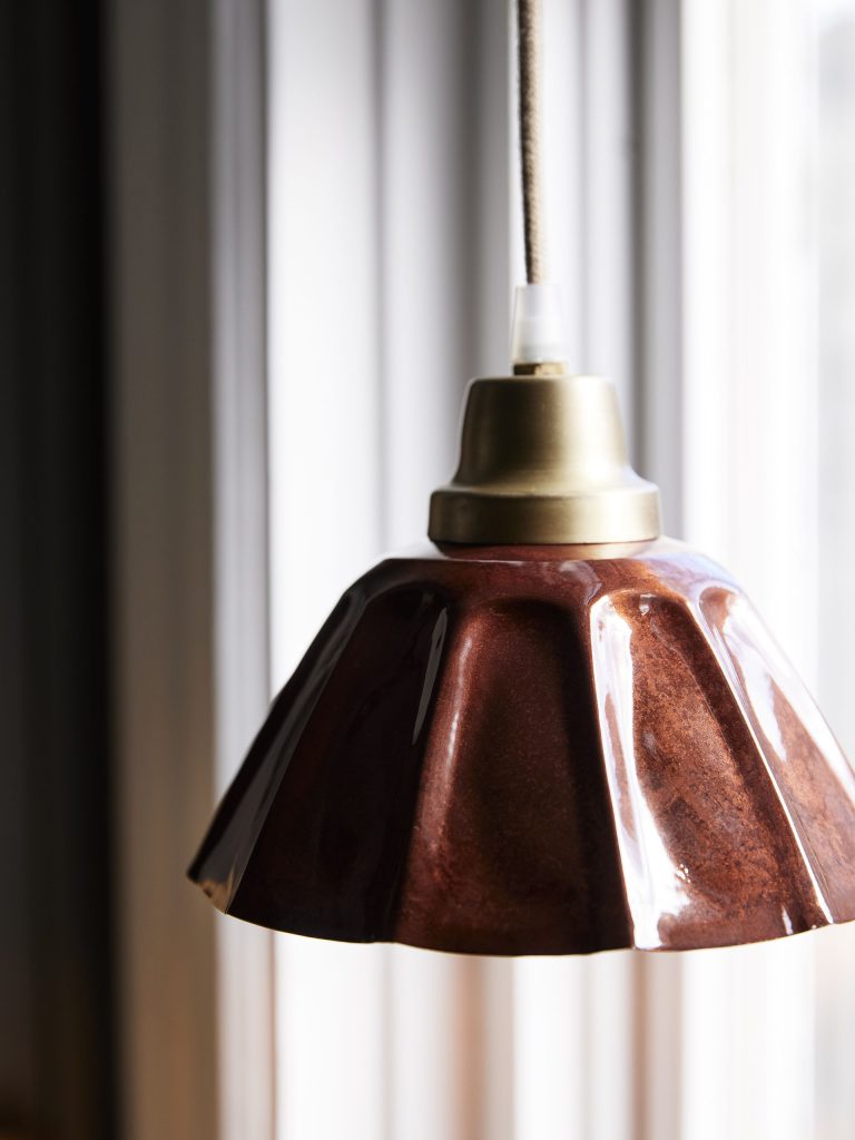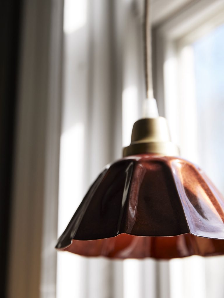 Ester on metallista valmistettu ikkunavalaisin, jossa on marmoria muistuttava emaloitu pinta. Vintage-tyylinen valaisin on väriltään terrakotta, yläosa antiikkimessingin värinen.