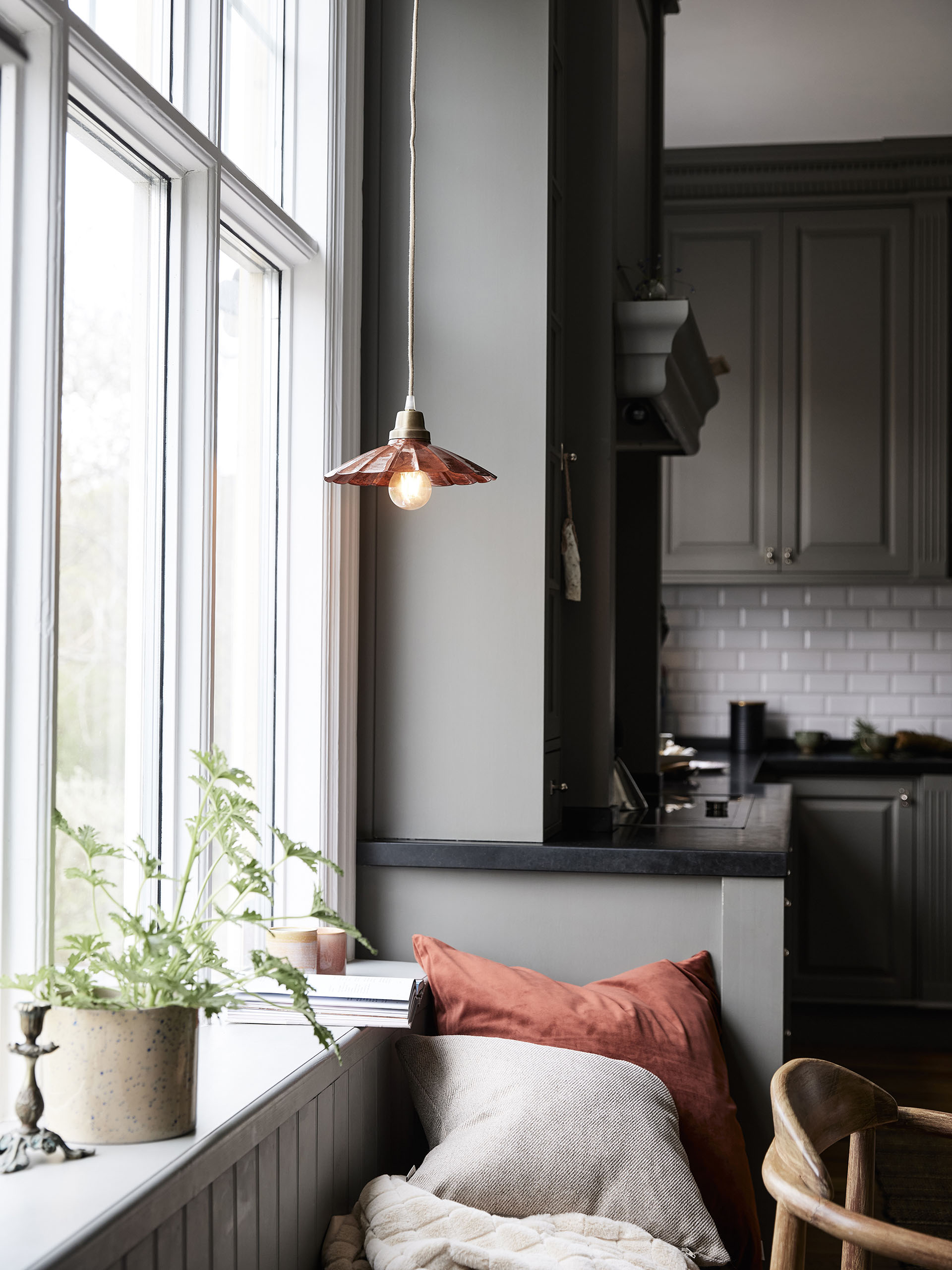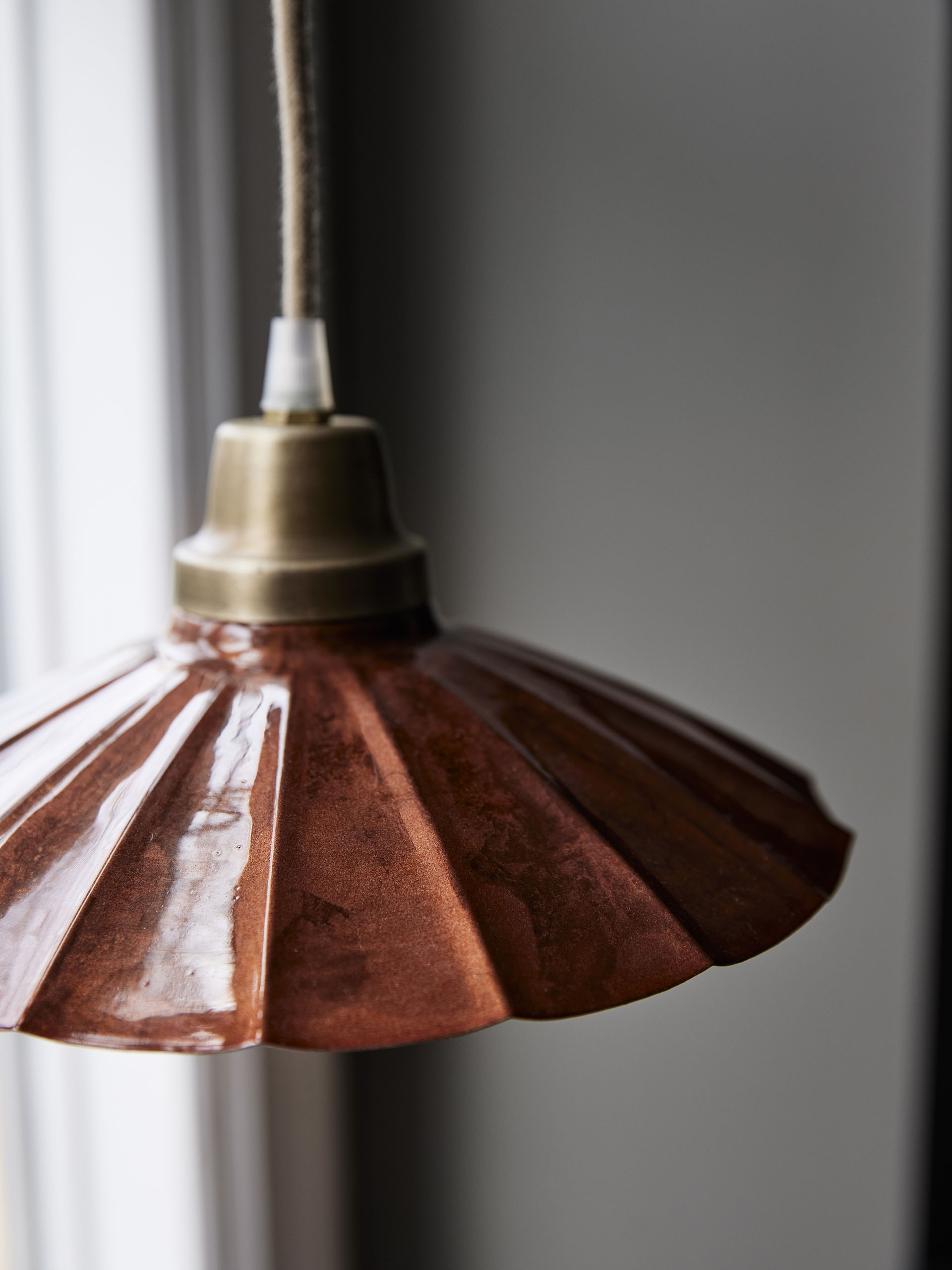 Ester on metallista valmistettu ikkunavalaisin, jossa on marmoria muistuttava emaloitu pinta. Vintage-tyylinen valaisin on väriltään terrakotta, yläosa antiikkimessingin värinen.