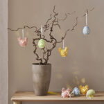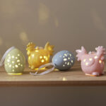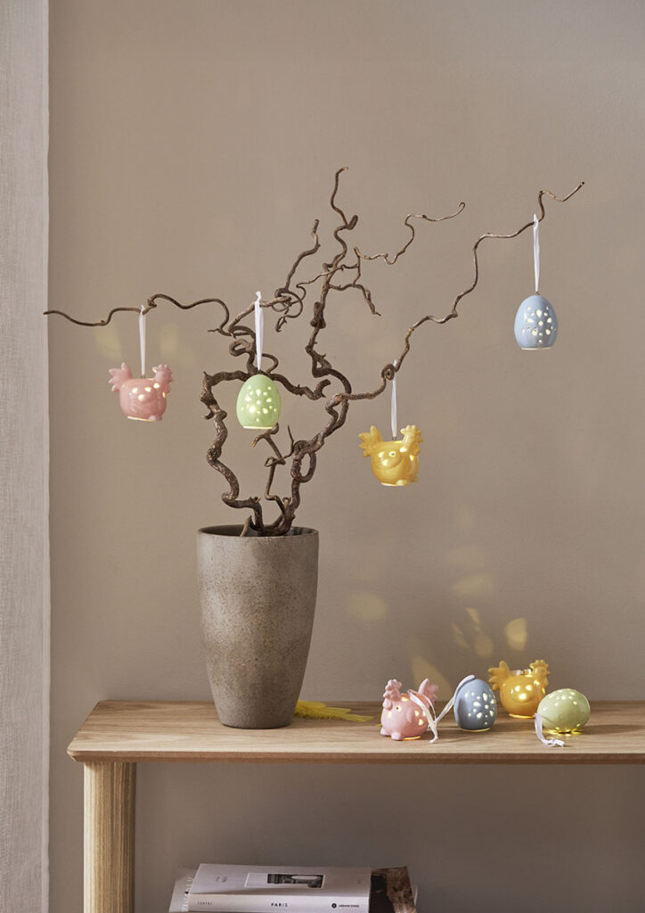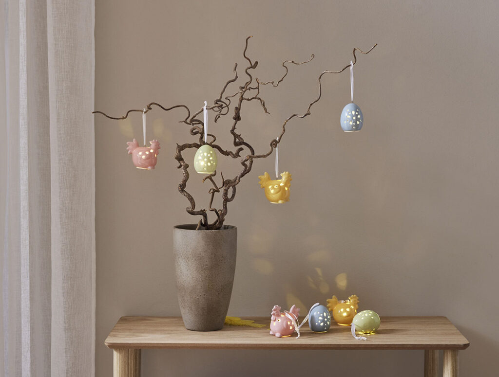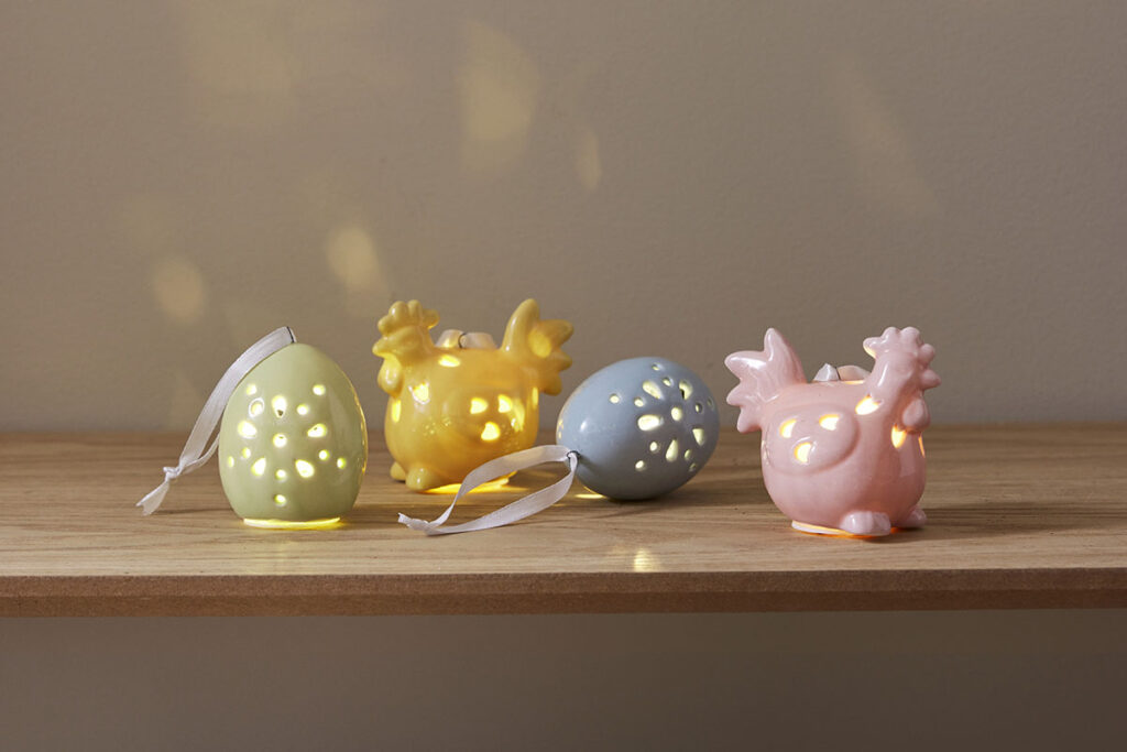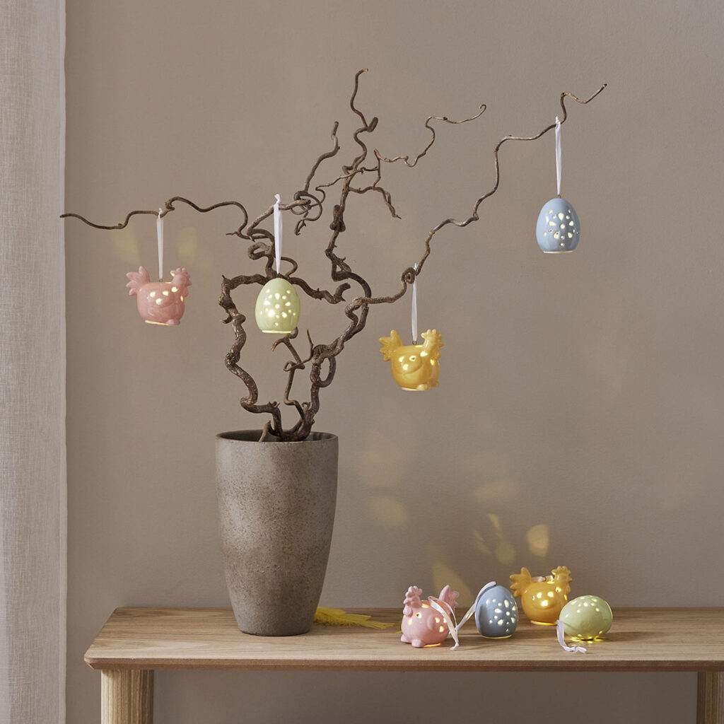 Pääsiäiskoristesetti, jossa on kaksi pääsiäiskukkoa ja kaksi munaa. Ihanat pastellinsävyiset koristeet on valmistettu kiiltävästä posliinista, ja niitä on helppo yhdistellä muiden pääsiäiskoristeiden kanssa. Koristeissa loistaa miellyttävä lämpimän valkoinen valo, ja ne ovat kauniita myös sammutettuina.