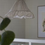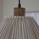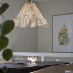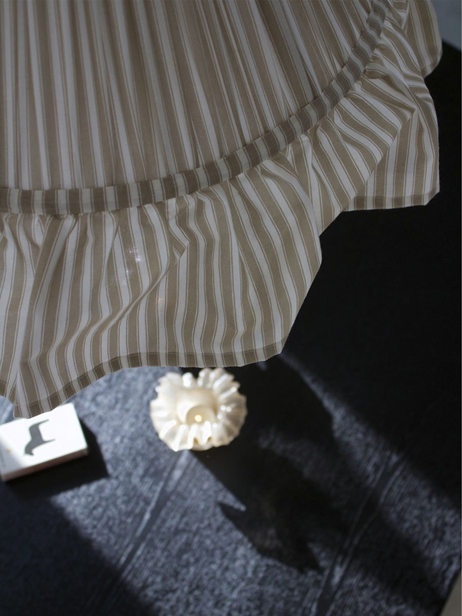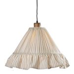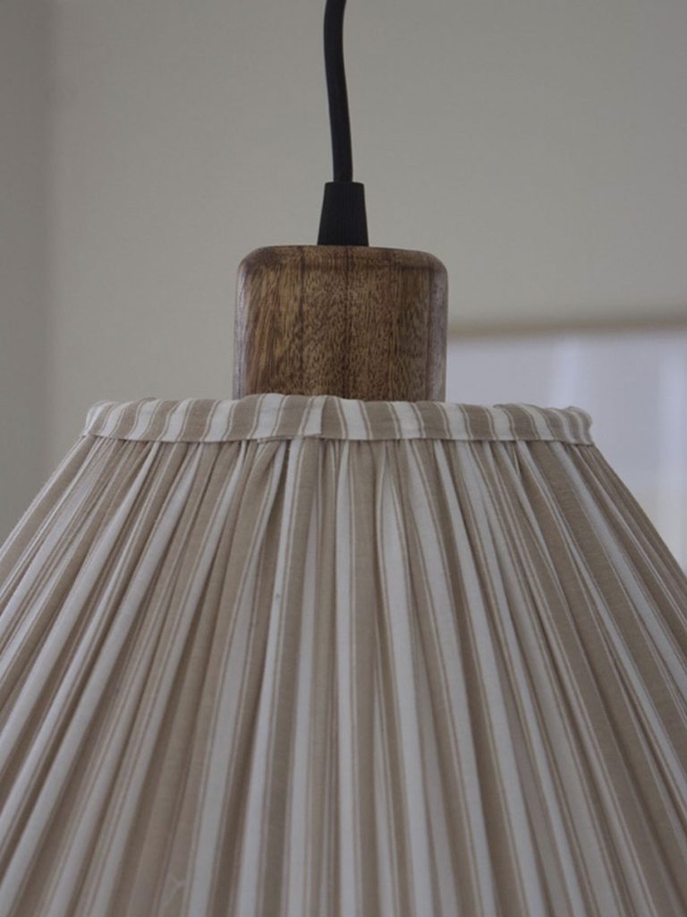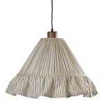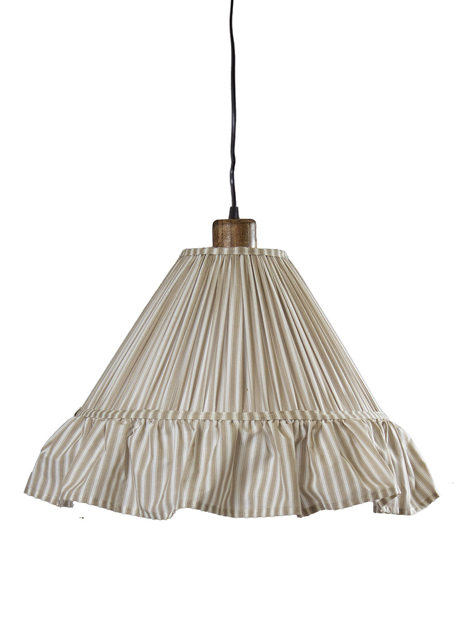 Estrid-riippuvalaisimen kartiomainen varjostin on verhoiltu rypytetyllä kankaalla, ja sen alareunaa koristaa 15 cm korkea röyhelö. Johtosarjassa on kaunis mangopuusta valmistettu lampunpidike.