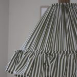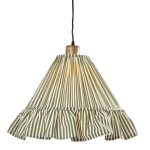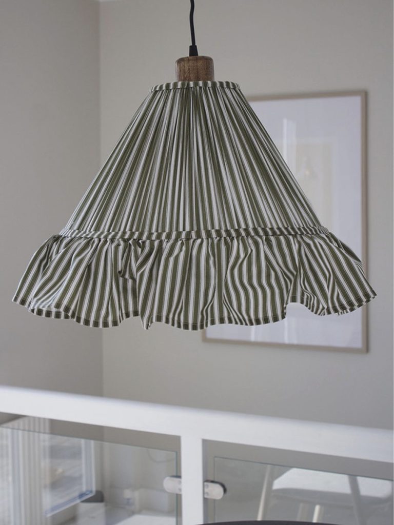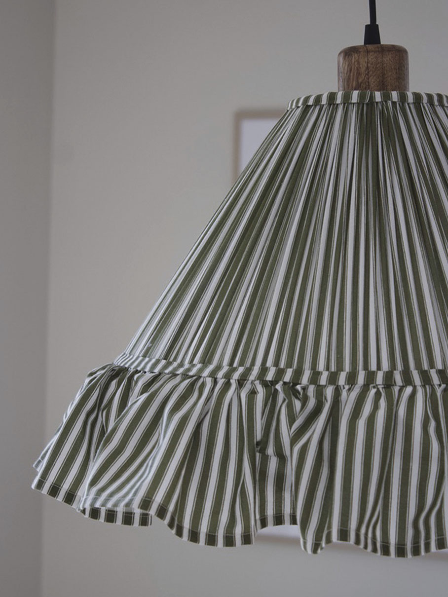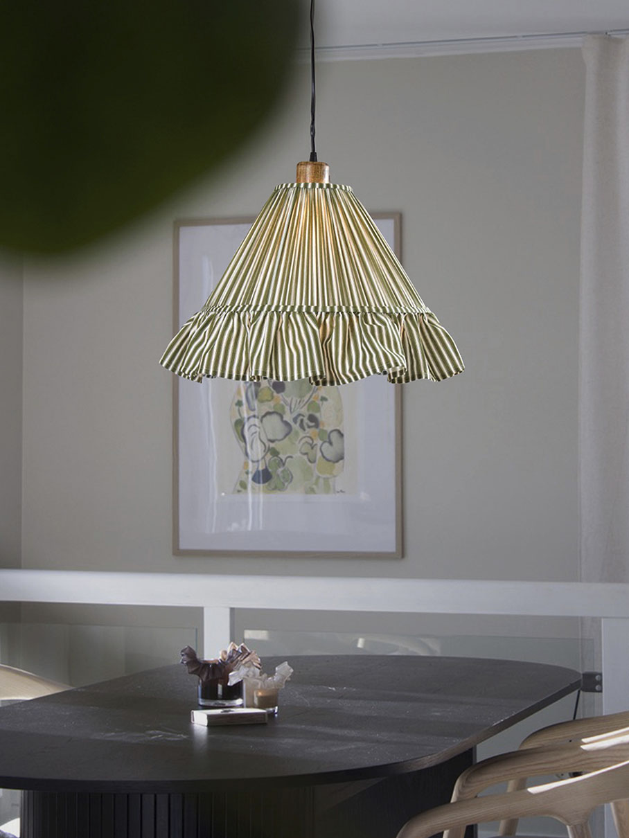 Estrid-riippuvalaisimen kartiomainen varjostin on verhoiltu rypytetyllä kankaalla, ja sen alareunaa koristaa 15 cm korkea röyhelö. Johtosarjassa on kaunis mangopuusta valmistettu lampunpidike.