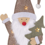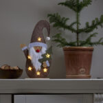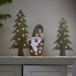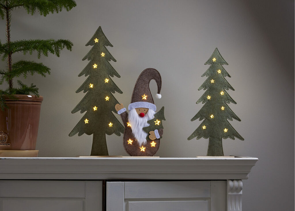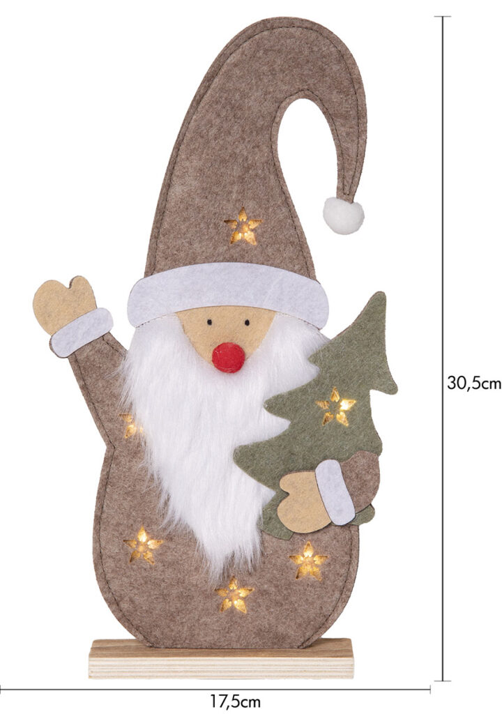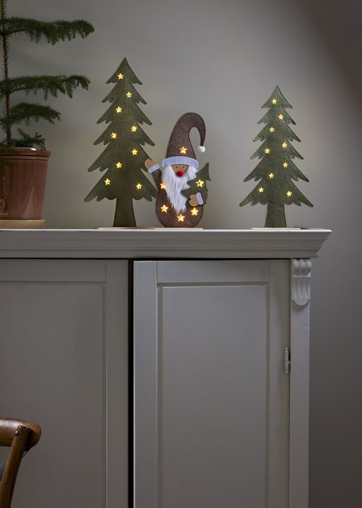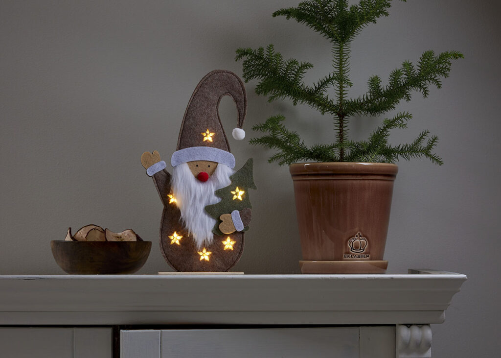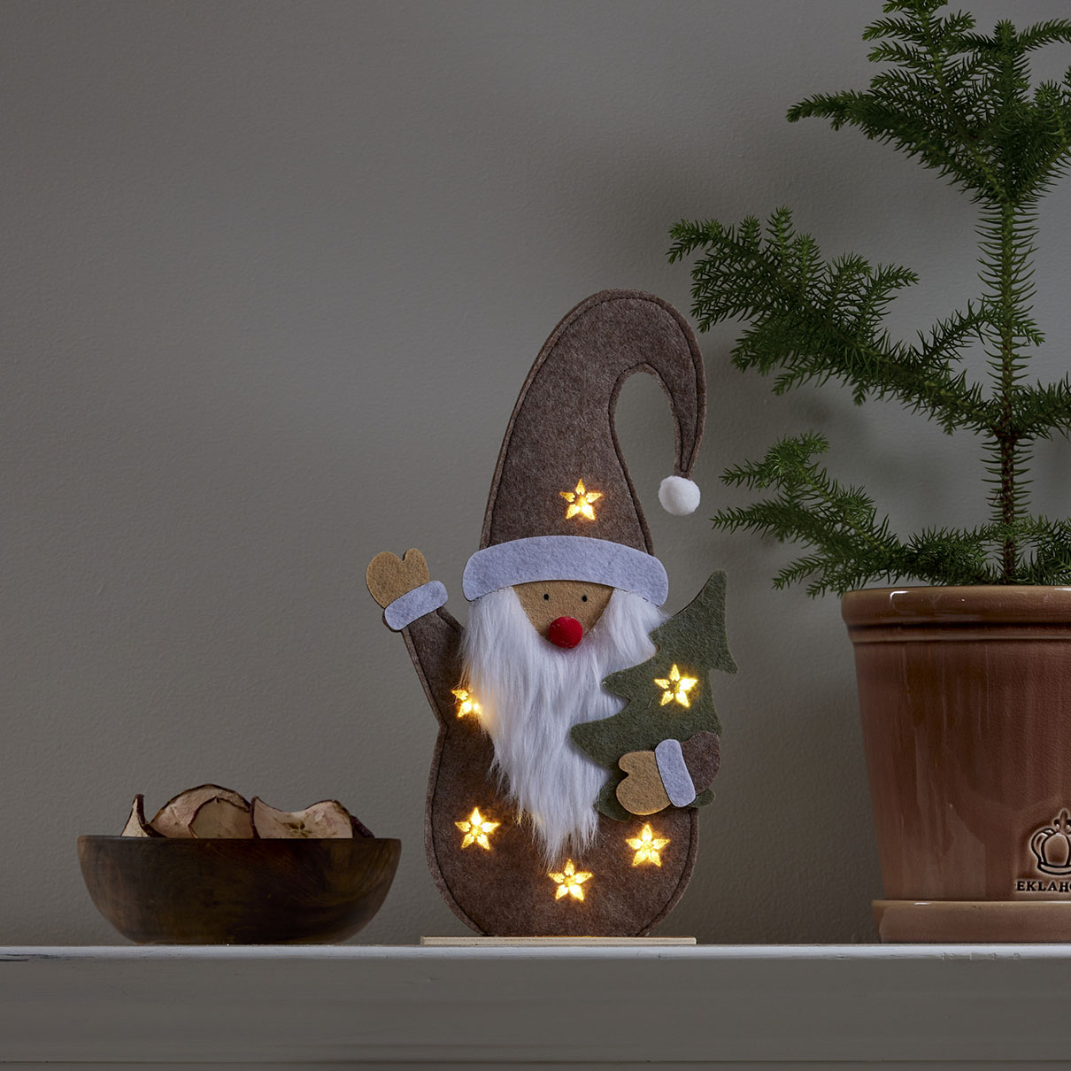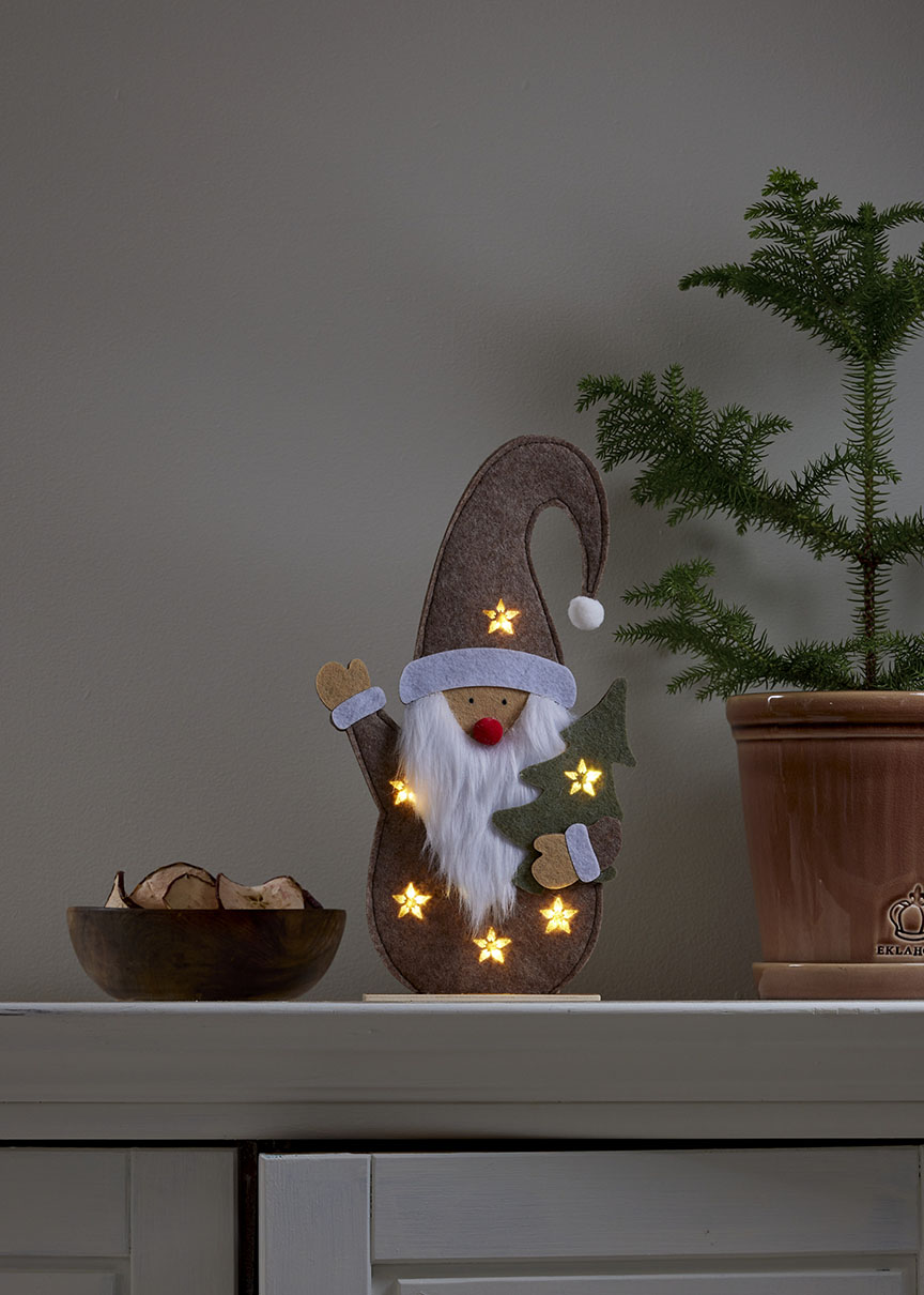 Puurunkoinen, huopakankaalla päällystetty tonttufiguuri, jonka tähtikoristeista loistavat pienet lämpimän valkoiset LED-valopisteet. Tonttukoriste sopii esimerkiksi pöydälle, hyllylle tai lipaston päälle tuomaan jouluista tunnelmaa.
