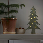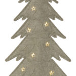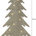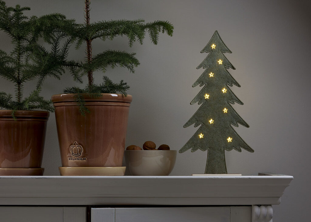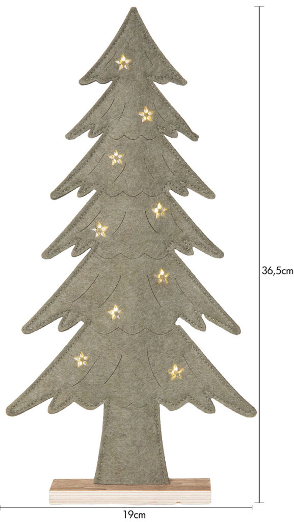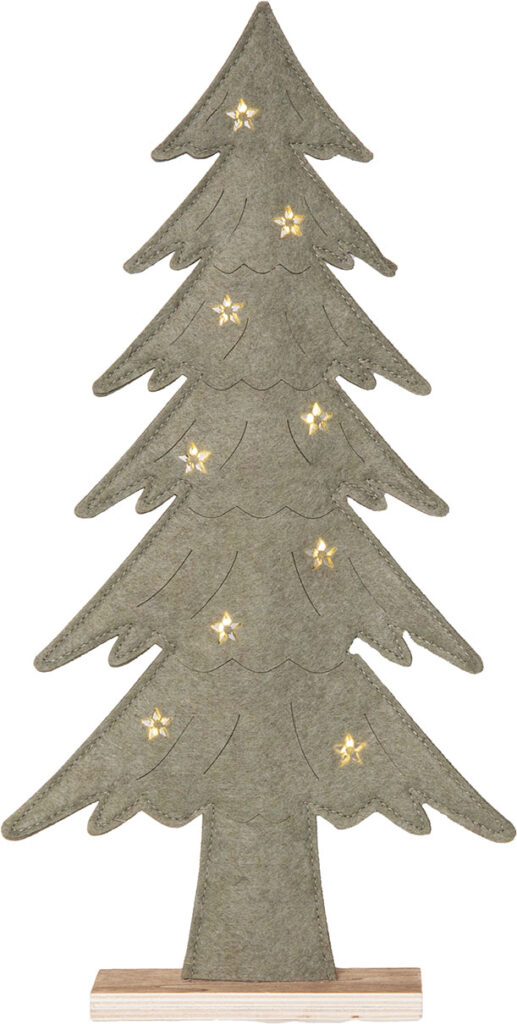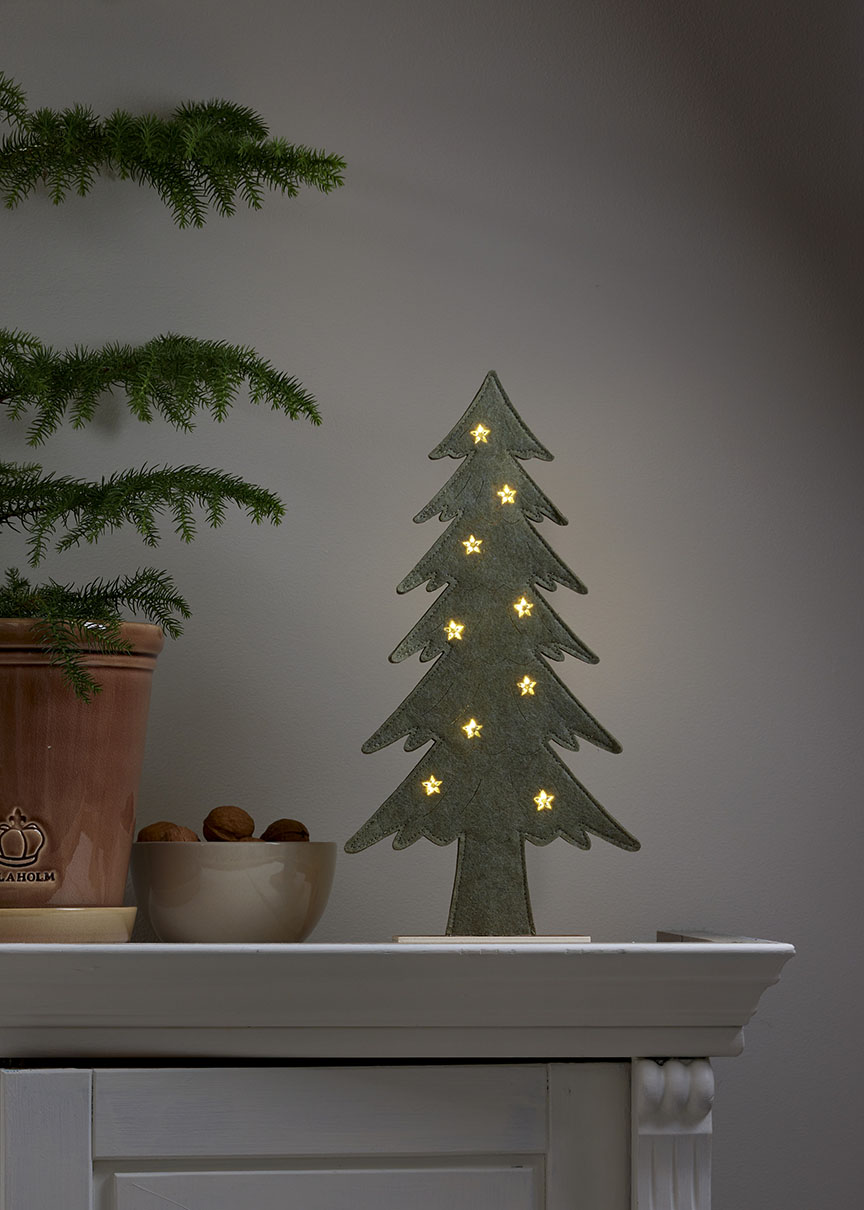 Puurunkoinen, huopakankaalla päällystetty kuusi, jonka tähtikoristeista loistavat pienet lämpimän valkoiset LED-valopisteet. Koriste sopii esimerkiksi pöydälle, hyllylle tai lipaston päälle tuomaan jouluista tunnelmaa.