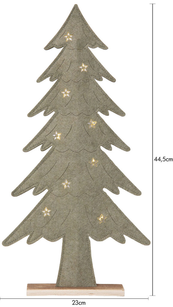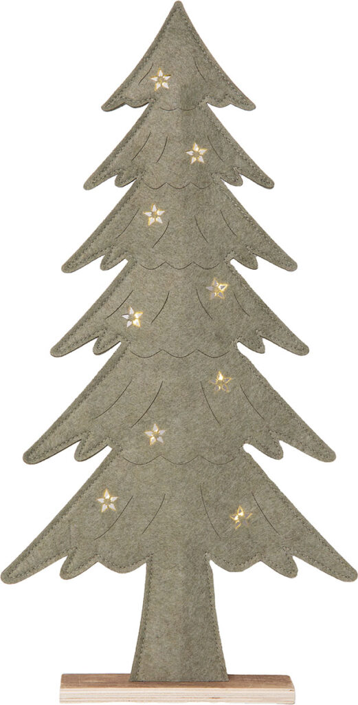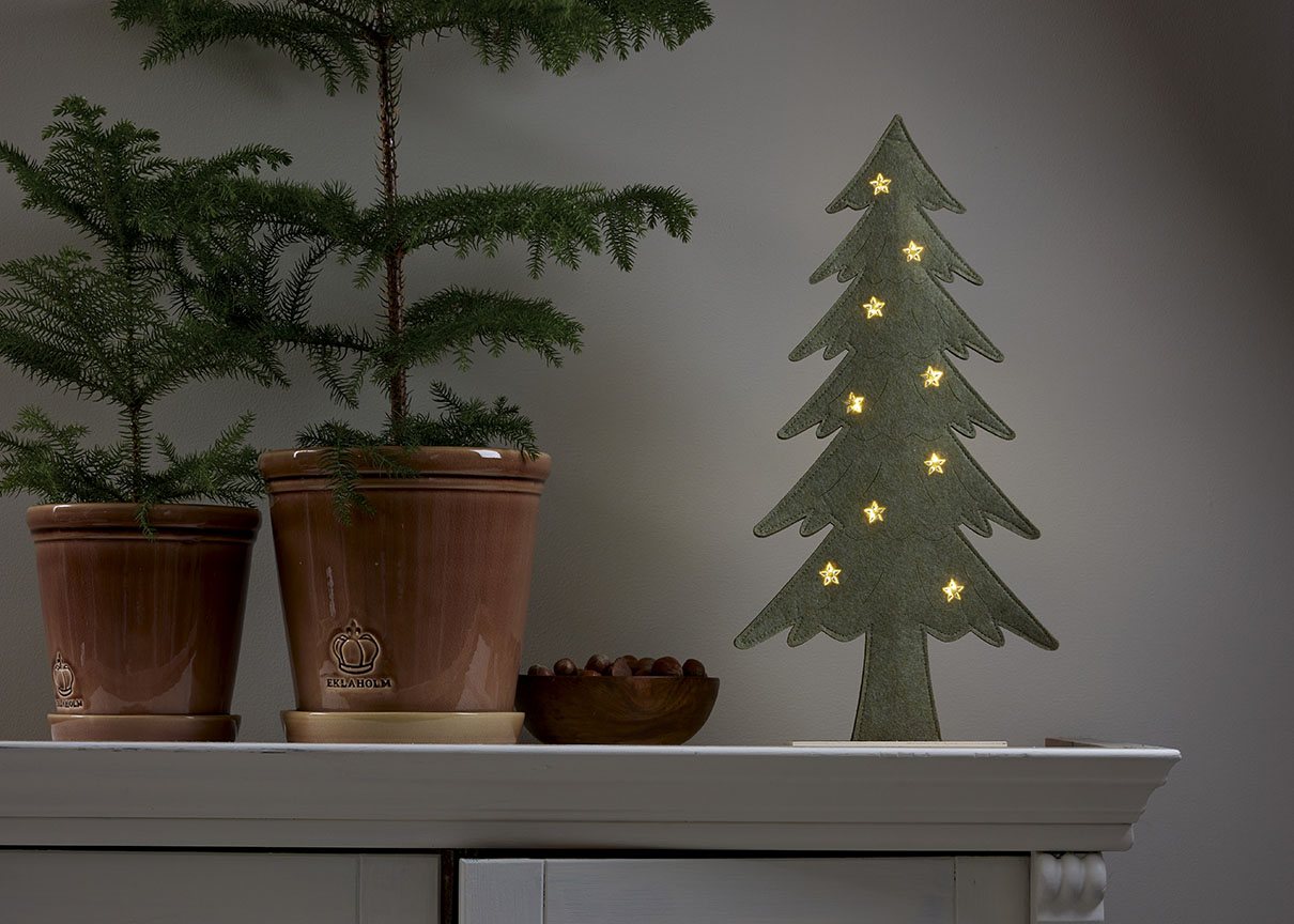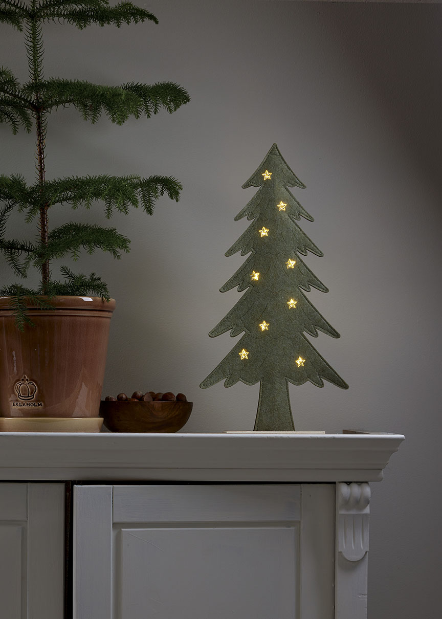 Puurunkoinen, huopakankaalla päällystetty kuusi, jonka tähtikoristeista loistavat pienet lämpimän valkoiset LED-valopisteet. Koriste sopii esimerkiksi pöydälle, hyllylle tai lipaston päälle tuomaan jouluista tunnelmaa.