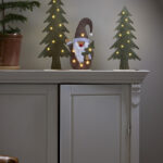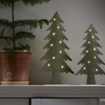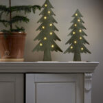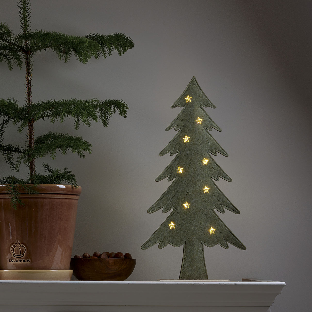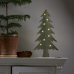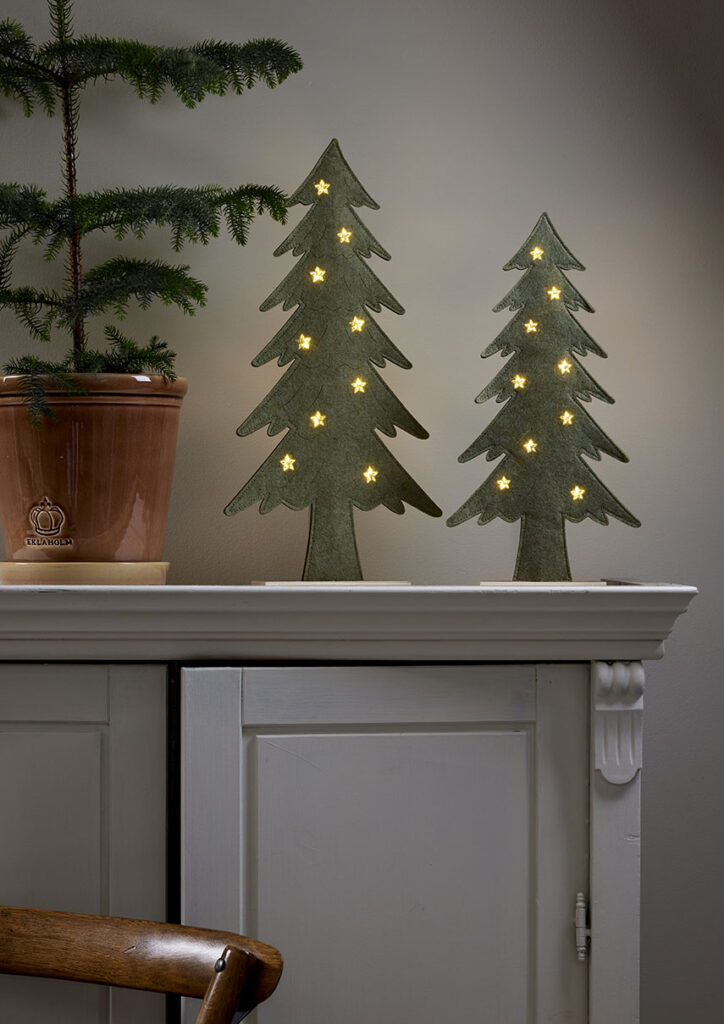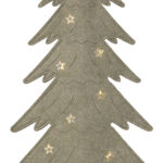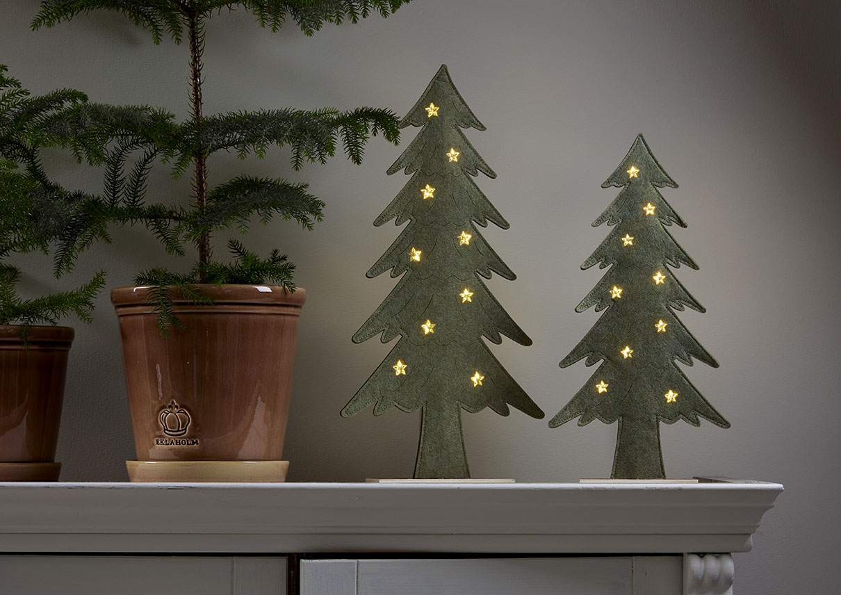 Puurunkoinen, huopakankaalla päällystetty kuusi, jonka tähtikoristeista loistavat pienet lämpimän valkoiset LED-valopisteet. Koriste sopii esimerkiksi pöydälle, hyllylle tai lipaston päälle tuomaan jouluista tunnelmaa.