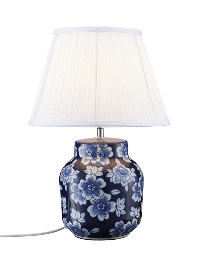 Fanny-pöytävalaisimen jalka on lasitettua keramiikkaa kauniilla sinivalkoisilla kukkakuvioilla. Valkoinen vekkivarjostin on halkaisijaltaan 32 cm ja sen korkeus on 21 cm.