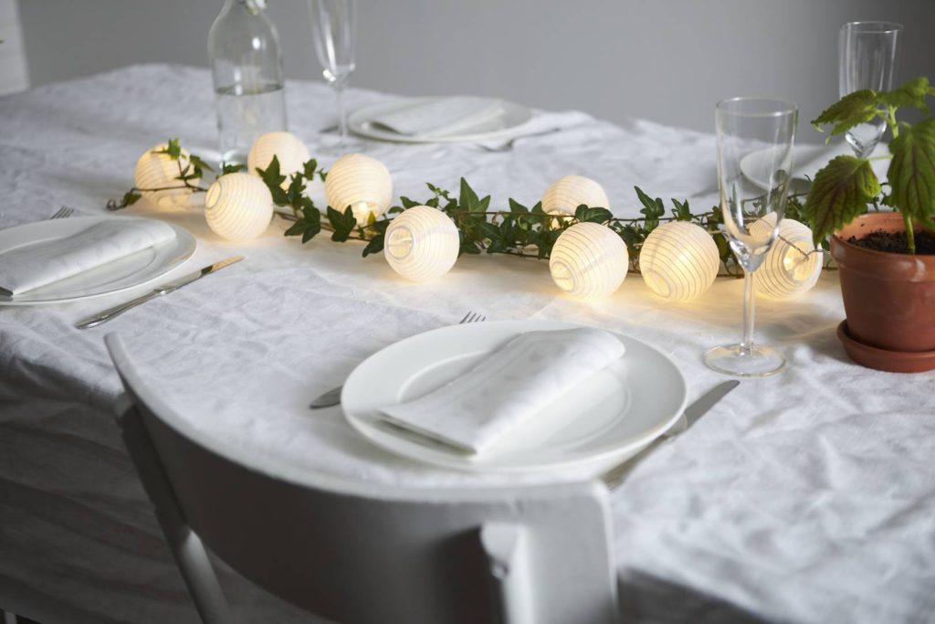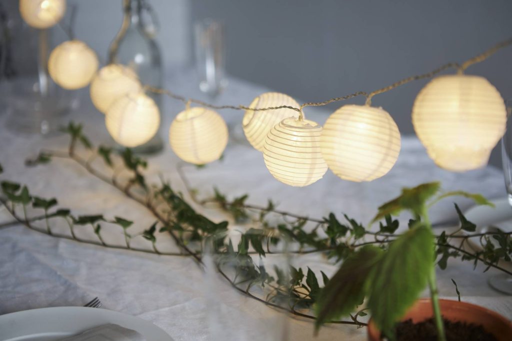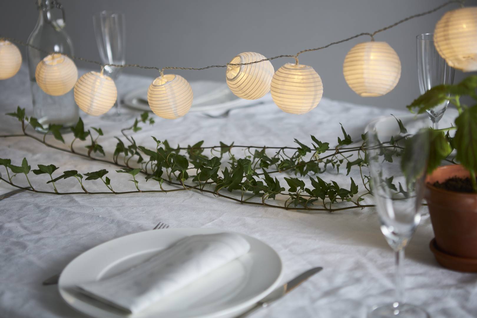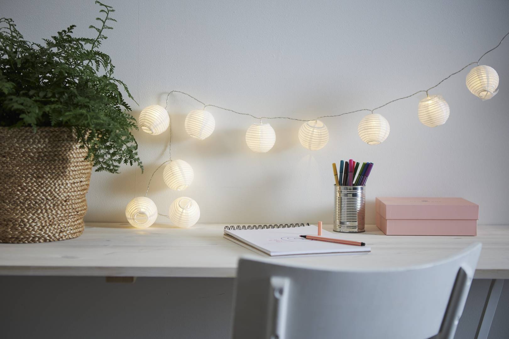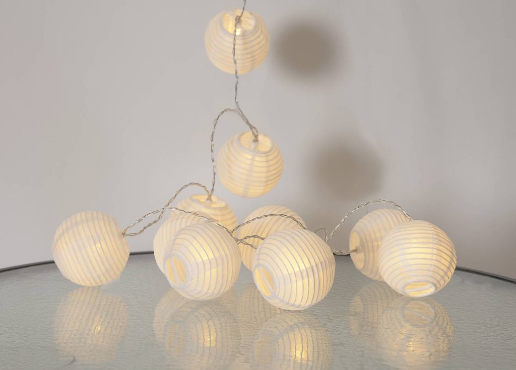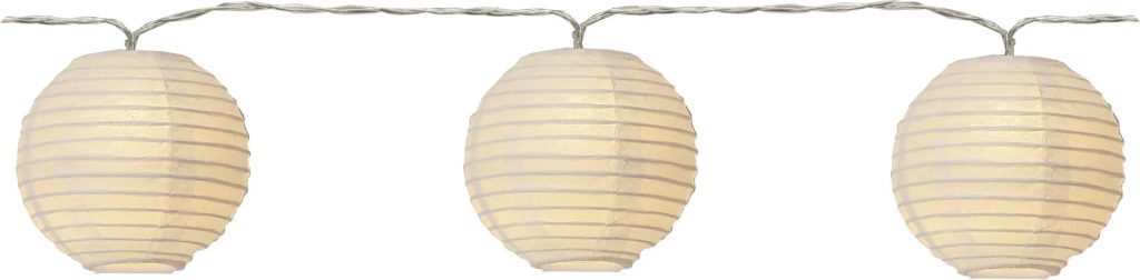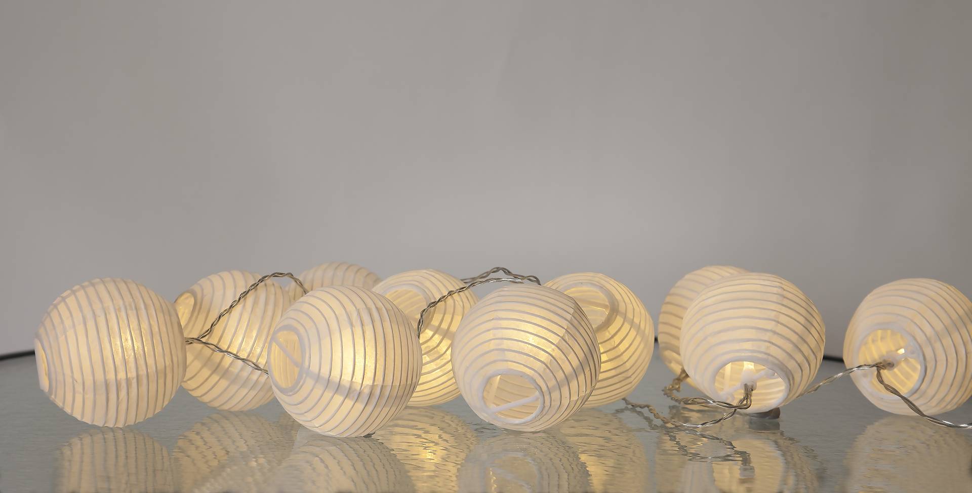 Sisäkäyttöön sopiva valosarja 10 valkoisella riisipaperilyhdyllä, joissa loistaa lämpimän valkoinen LED-valo. Sopii tunnelmavalaistukseksi sekä arkeen että juhlaan.