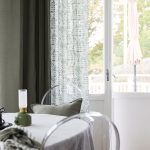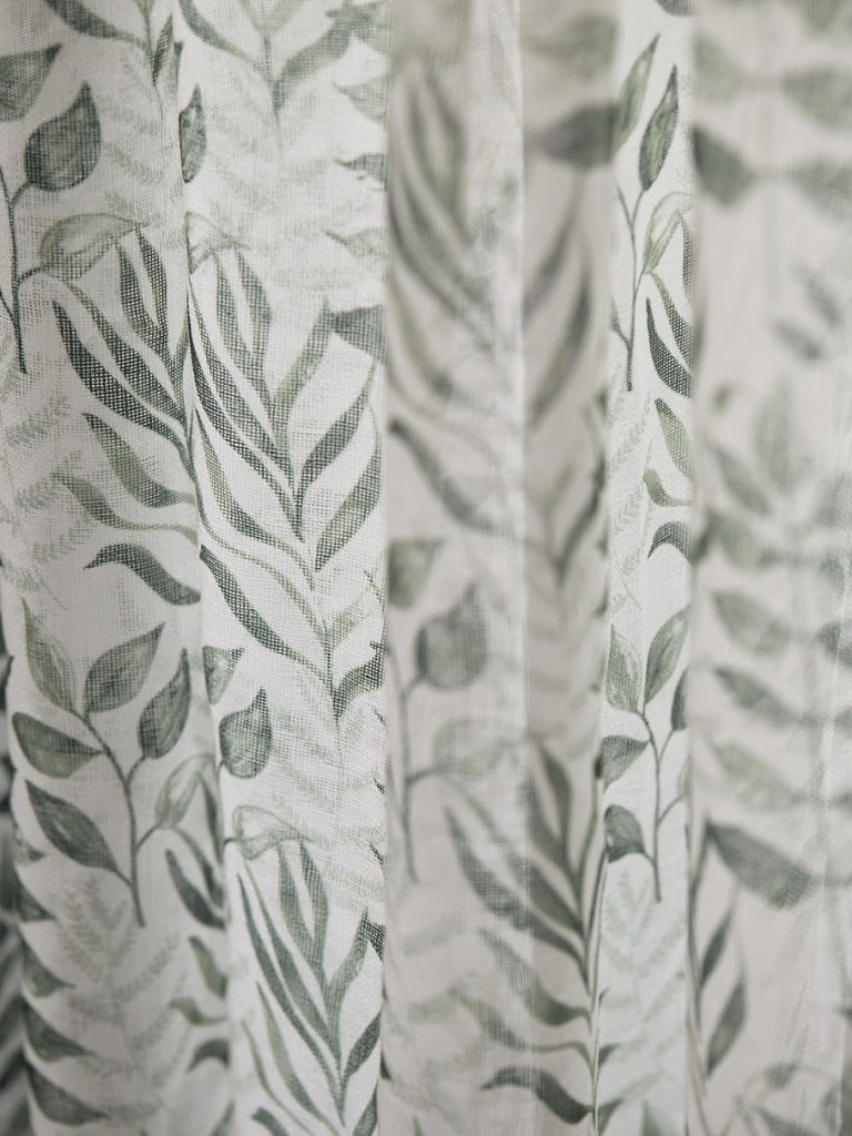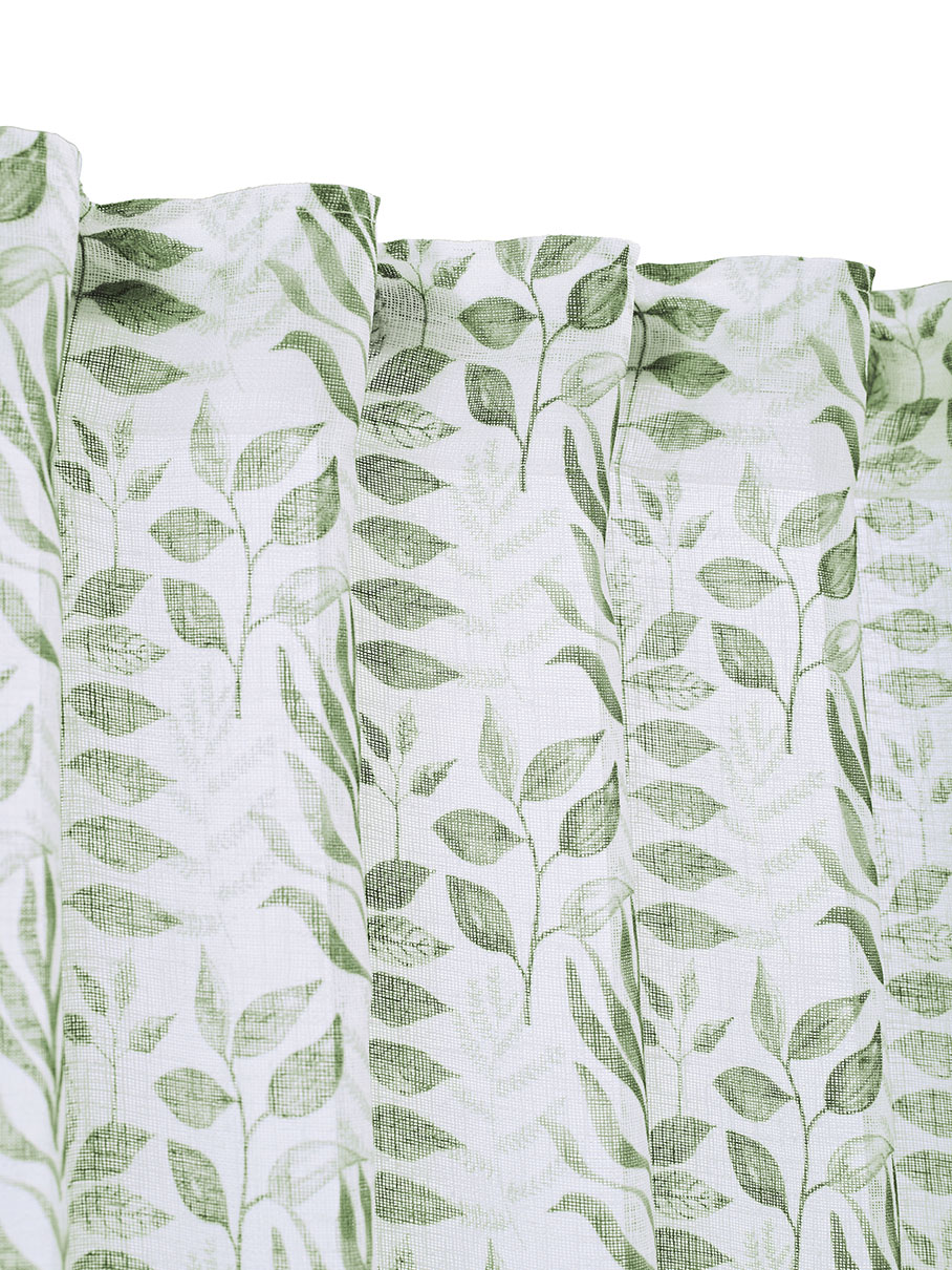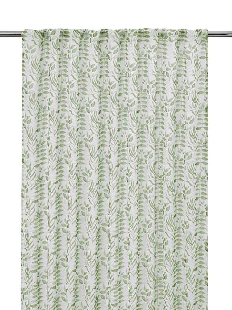 Läpikuultavat kuvioidut verhot monitoiminauhalla. Verhoissa on monitoiminauha yläreunassa, päärmätyt sivureunat ja yliluotteluommel alareunassa. Pakkaus sisältää 2 verhoa.