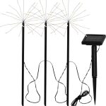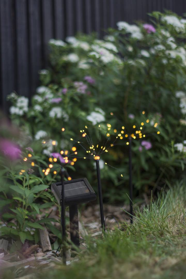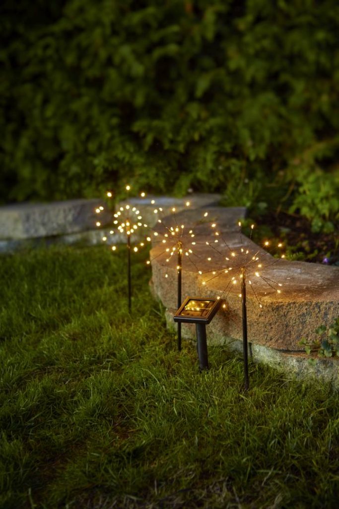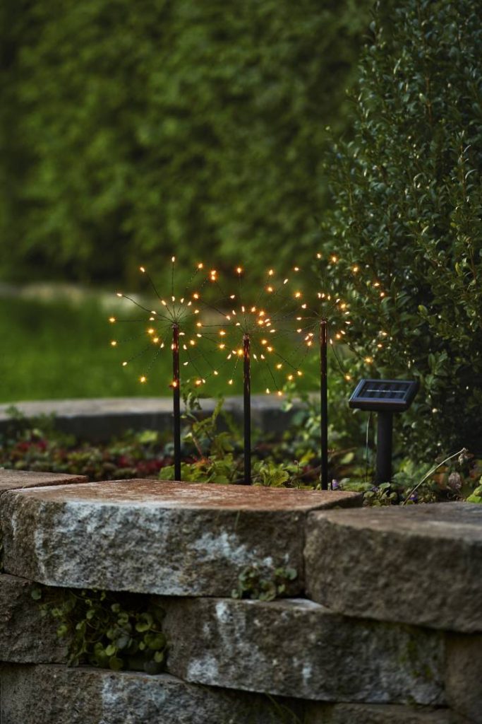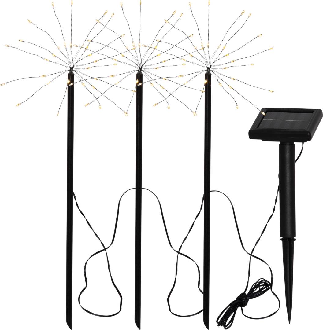 Aurinkokennolla toimiva kolmiosainen Firework-koristevalaisin, jossa on 3×30 lämpimän valkoista LED-valopistettä. Koristeiden välissä oleva johto on 50 cm pitkä.