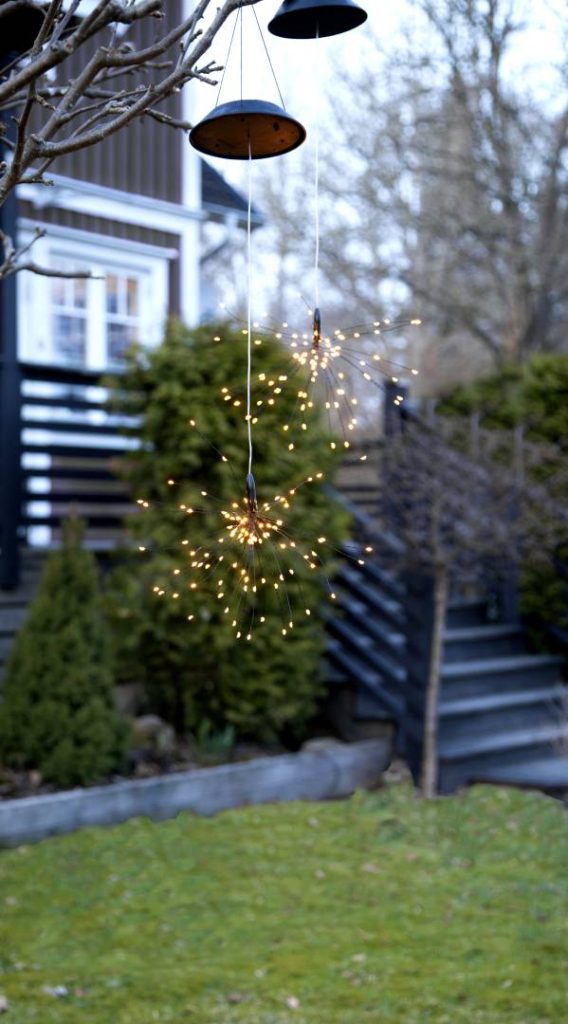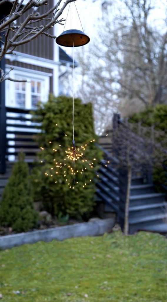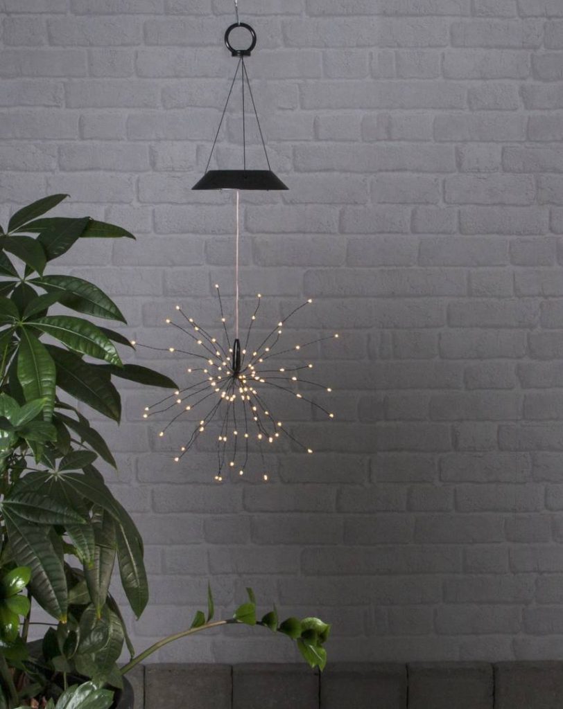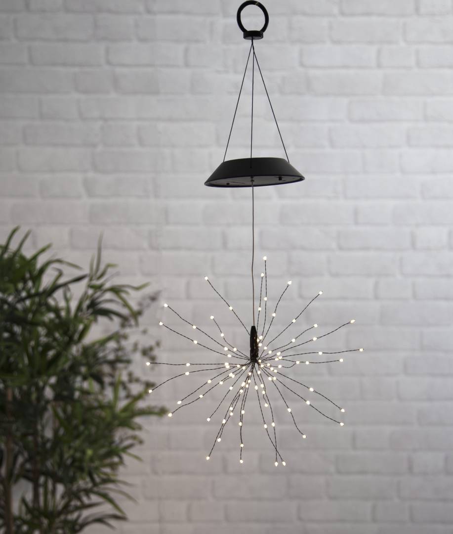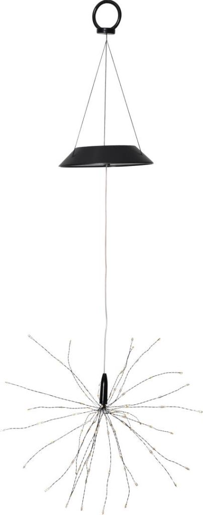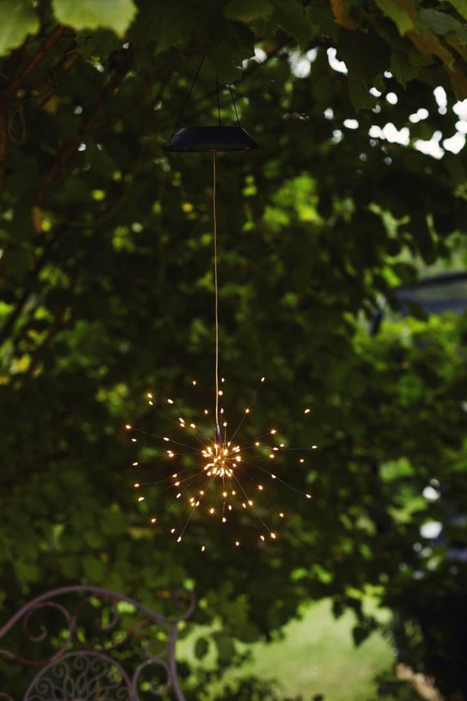Aurinkokennolla toimiva ripustettava Firework-koristevalaisin, jossa on 90 lämpimän valkoista LED-valopistettä.