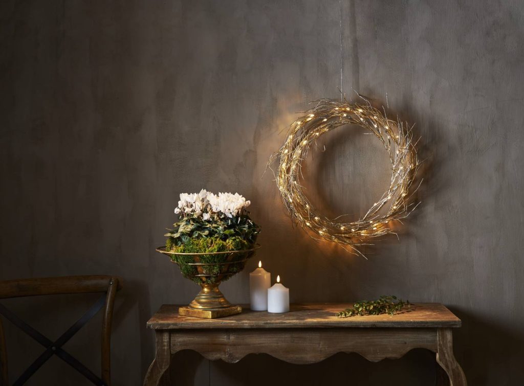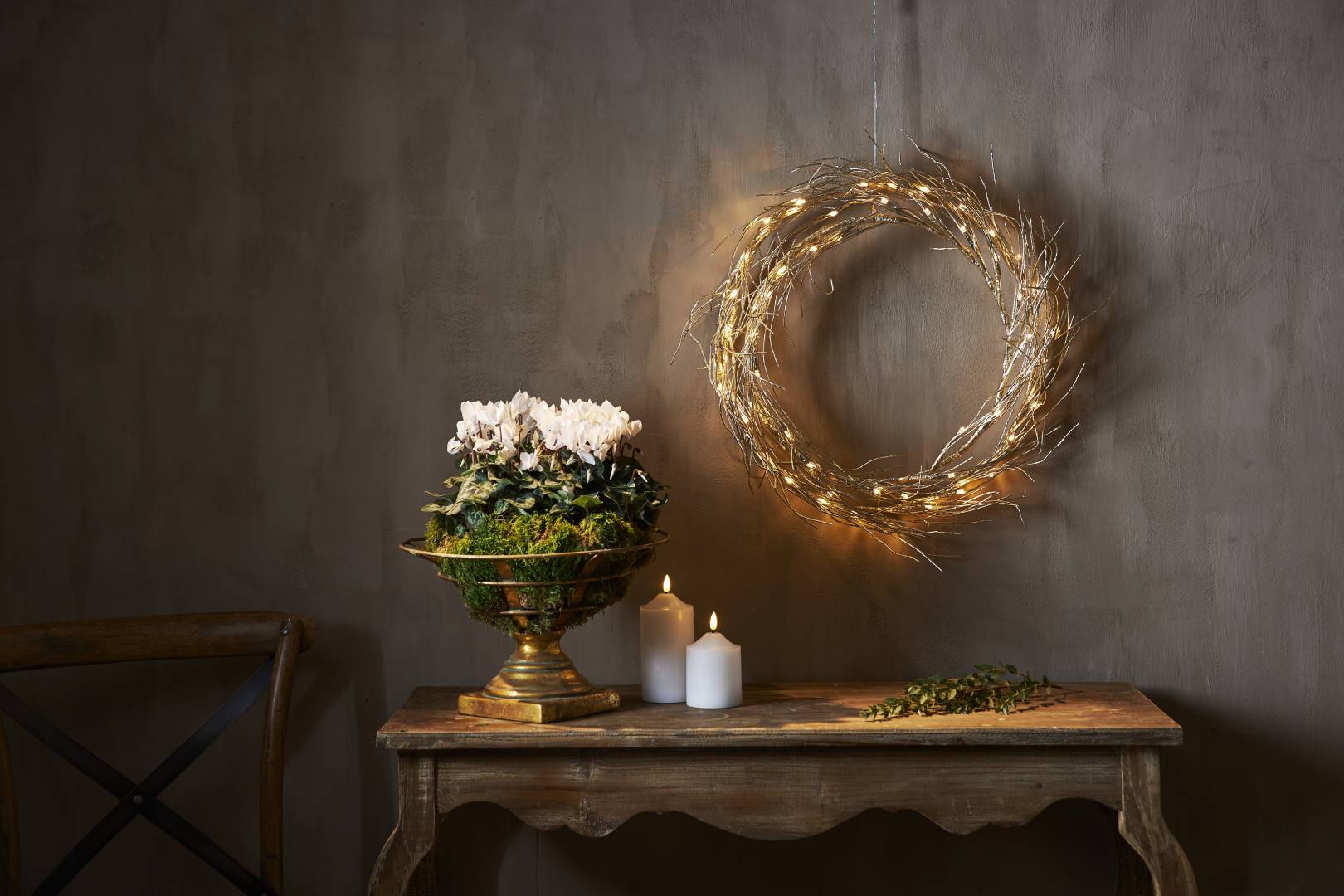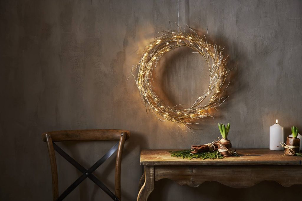Kranssia valaisee 50 lämpimän valkoista LED-valopistettä.