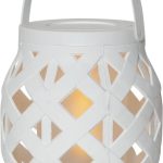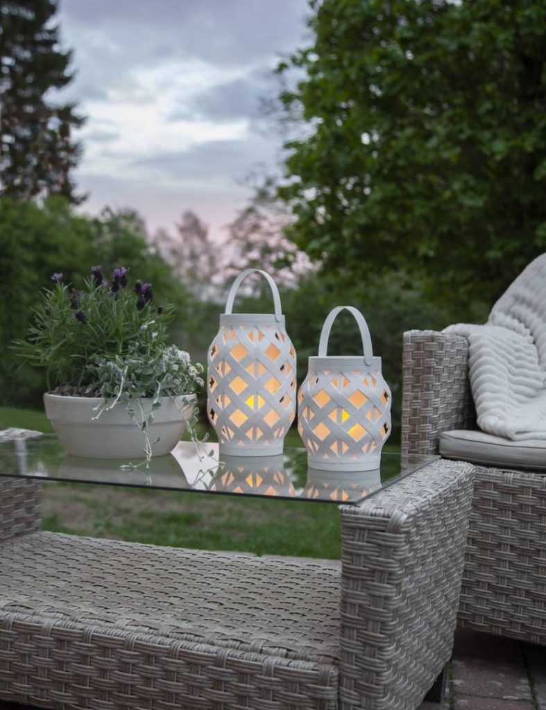 Valkoinen muovilyhty, jossa liekehtivä Flame-valo. Sopii sekä sisä- että ulkokäyttöön.