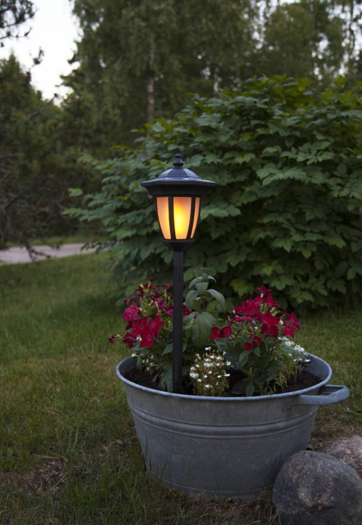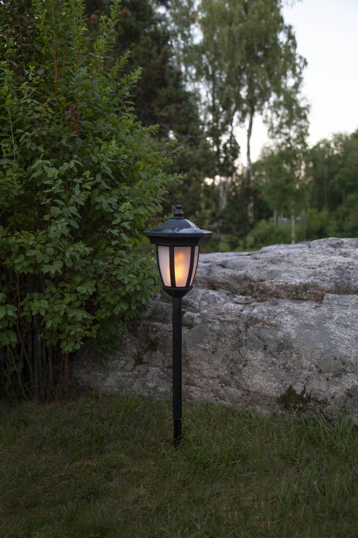 Aurinkokennolla toimiva musta valaisin, jossa on keltainen liekehtivä LED-valo. Valaisinta voi käyttää seinä- tai pöytälyhtynä tai tolpan päällä (korkeus n. 35 cm), lattia- tai kulkuvalona yhdellä väliosalla (korkeus 49 cm), tai kahdella väliosalla (korkeus 63 cm).